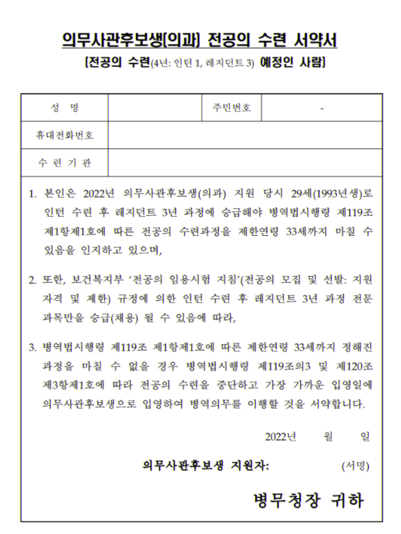 의사면허를 취득하고, 인턴을 지원할 때, 남자들은 여자들과 다르게 지원 서류에 몇 가지가 추가된다. 그중 가장 중요한 것이 의무사관후보생 전공의 수련 서약서이다.