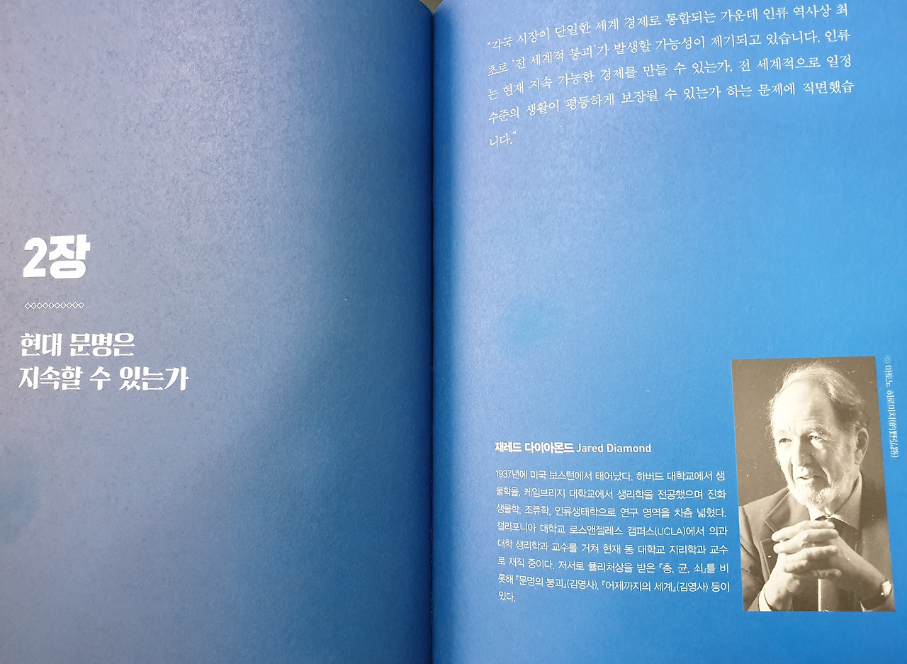 그는 문명의 붕괴에 대한 다양한 이야기를 하고 있는 학자인데, 지금 현대 사회가 자원의 남용, 국가 간 소득의 격차, 인종, 종교 등으로 인해 언제든지 전쟁의 위험을 안고, 전체적 문명 붕괴의 위험 속에 살고 있다고 말하고 있습니다.