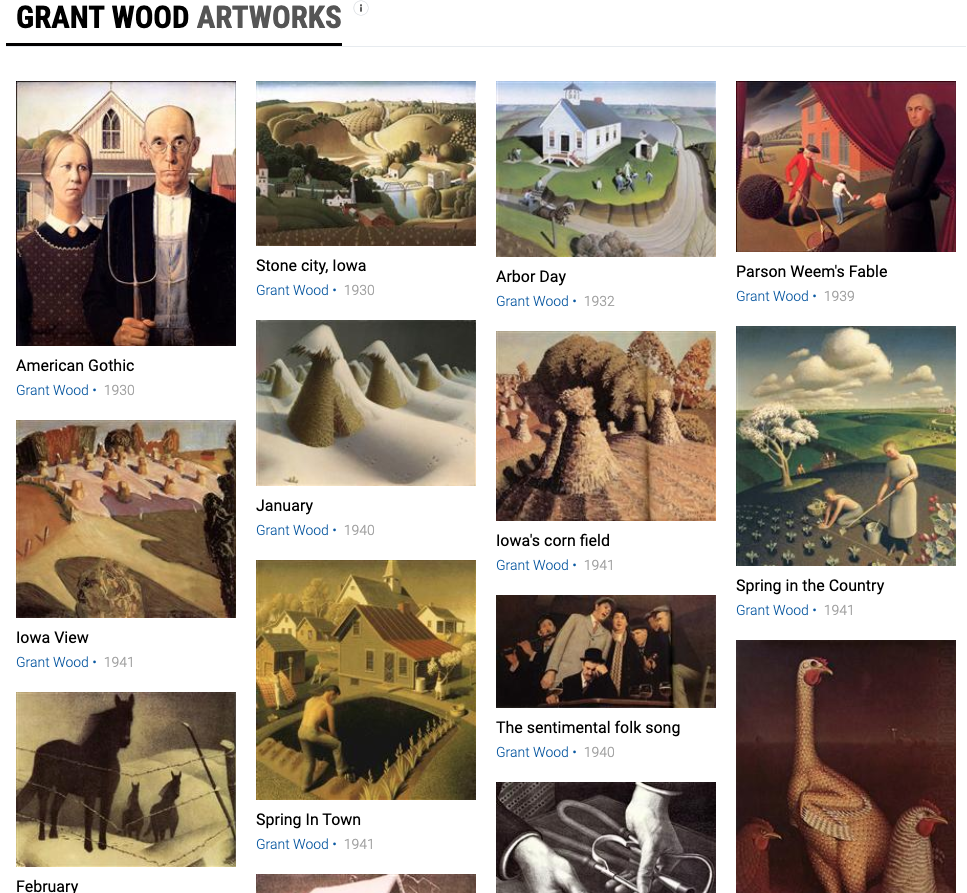 오늘 함께 살펴본 것도 작품으로 시작했으나 작가 소개가 되었네요. 미국이 영국에 대한 열등감, 유럽에 대한 숭배가 있다고 들은 적이 있습니다. 나라의 역사가 몇 백년 밖에 안되지만 거대한 연방국을 건설해낸 미국의 정통 법통을 향한 달음박질이 그랜트 우드를 보며 느껴졌습니다. 대한민국은 조선왕조만으로도 5백년(대하드라마로 다룰 만큼)을 구가했으니, 미국의 역사는 상대적으로 짧고 수많은 인종, 문화, 종교가 어울려 살아야만 했던 어려움이 다가옵니다. 잘나가던 미국의 경제상황이 1929년에 주식시장 떡락으로 1/4의 노동자가 실업했다고 하니 엄청난 경제적 시련이었겠네요. 나중에 제2차세계대전으로 군수물자를 찍어내면서 경제활황을 맞이한 것 같고요.(홍춘욱, 돈의역사 내용 생각남) 전쟁이 나고 경제가 돌아가니 돈이 돌고 일자리가 늘어나서 과거를 회상하는 지역주의 화풍은 인기가 시들해질 수 밖에 없었겠습니다.