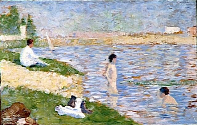 조르주 쇠라의 작품설명을 하고 있자면, 덧칠의 대가가 아니었나 생각합니다. 유화물감으로 덧칠을 거듭하면서 새로운 그라데이션이나 입체감, 원근감을 나타낼 수 있었을테고 색점을 일정한 간격으로 찍어 멀리서 보면 섞여서 보일 겁니다. 이런 일정한 크기의 색점, 그 간격을 조절해가며 조직적이고 계획적으로 찍은 것은 치밀한 계산에 의해 표시된 유려한 포토샵 화면 같았을 겁니다.