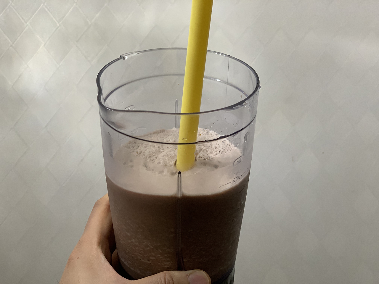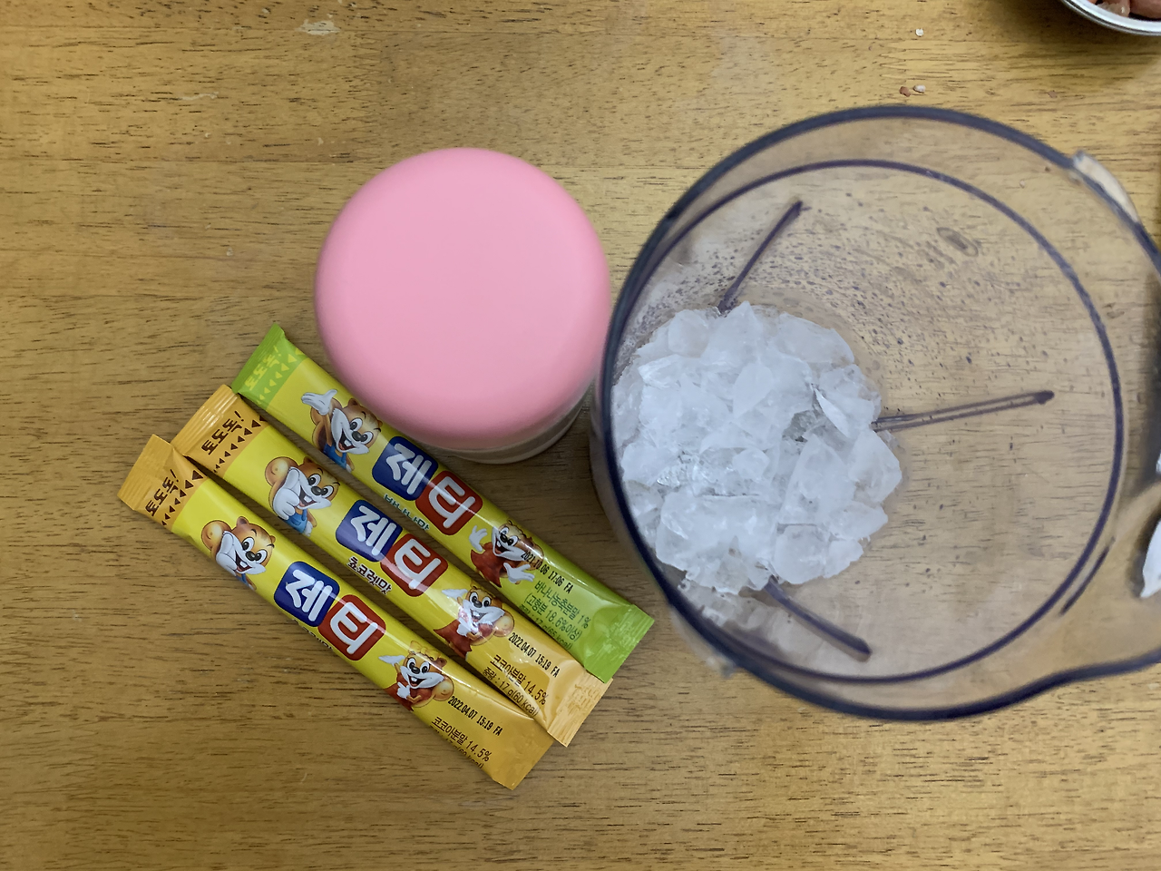 아들이 좋아하는 완전초코바나나 메뉴를 매번 사러가기도 불편하고 돈도 만만찮게 듭니다. 그래서 마트에 갔던 어느날, 제티 초코맛이 있으니 바나나맛이 있다면 어떻게 해볼 수 있겠다 상상했는데, 바나나맛을 만난 거죠. 초코맛 2포, 바나나맛1포를 우유 150ml와 잘 섞어줍니다. 얼음과 함께 분쇄해줍니다. 완.초.바 완성!