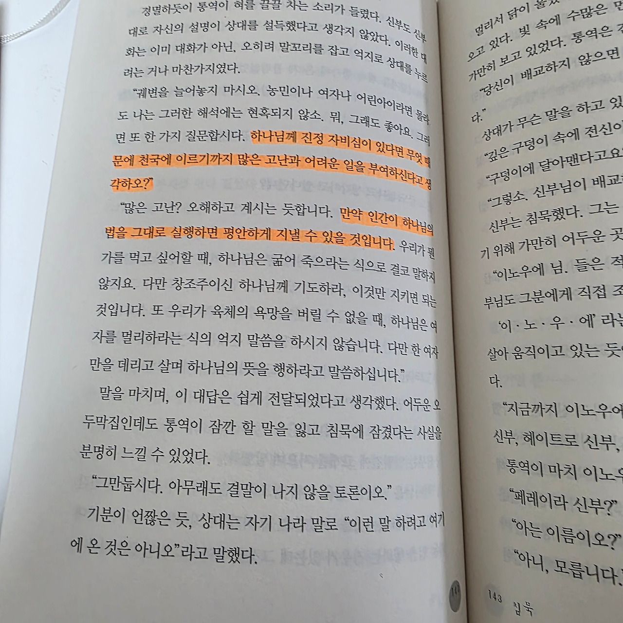 내가 읽은 감상으로 침묵은 단순한 종교소설이 아니다. 신이란 존재에 대한 의심과 고뇌, 신앙을 지킨다는 것의 윤리와 책임, 그리고 인간이 얼마나 연약한 존재인지 되묻게 하는 작품이다.