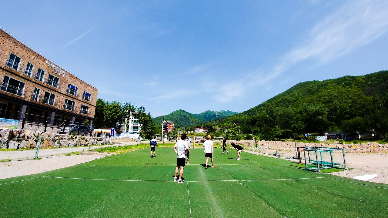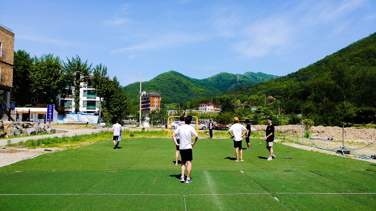 가평 MT촌에서 오전에 간단히 풋살을 즐기는데 푸른 하늘과 초록빛 잔디가 굉장했다.