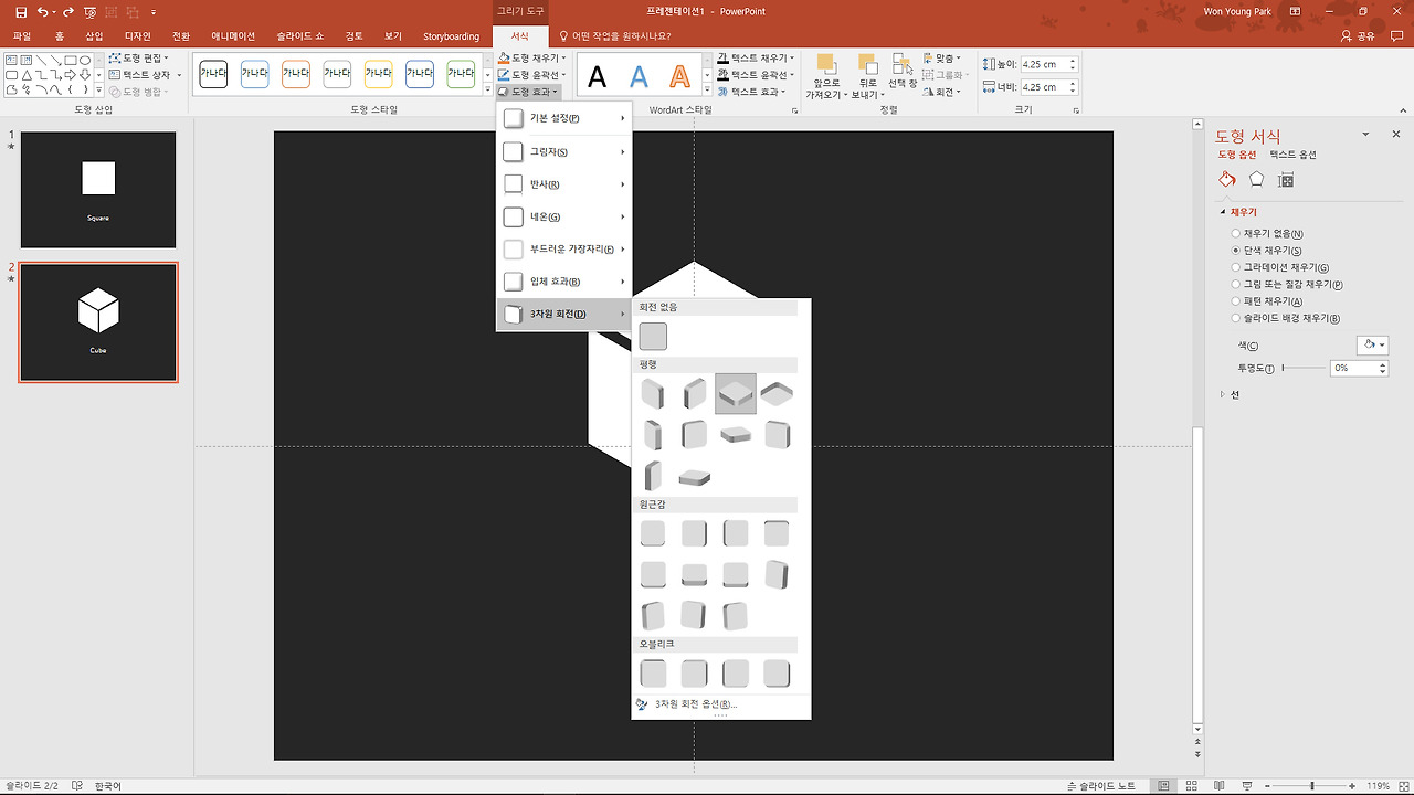 그려둔 사각형 하나를 선택하고 그리기 도구 - 서식 - 도형효과 - 3차원 회전 - 평행: 등각 순으로 접근하면 이미지들이 적당한 각도로 3차원 회전을 합니다.