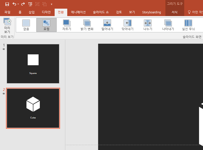 마지막으로, 2번 슬라이드(타깃 슬라이드)에서 전환 - 모핑 선택을 하여 마무리 합니다.