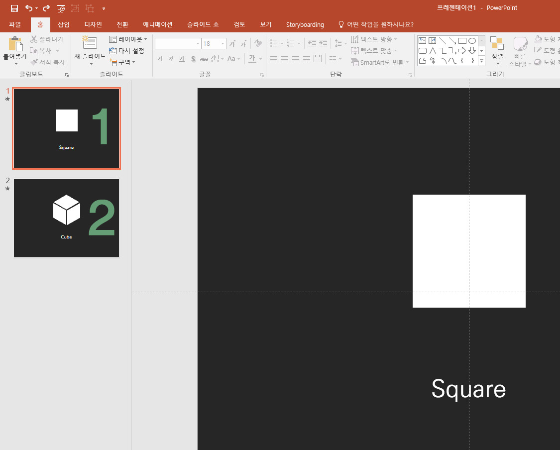 현재 1번 슬라이드를 작업하고 있는데요, 이 작업 중인 슬라이드가 애니메이션을 주기 이전 슬라이드라고 생각하시면 됩니다. 그렇게 2번 슬라이드는 효과가 진행된 이후 모습을 보여주겠지요.