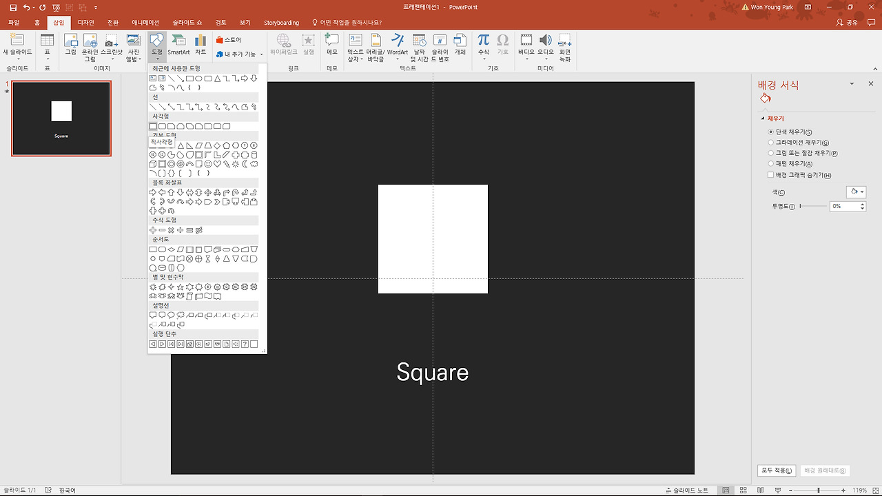 삽입 - 도형 - 사각형을 누르고 Shift 를 누른 상태에서 적당한 사이즈의 정사각형을 그려 넣습니다.