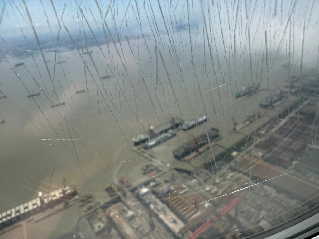 (아직까지도 중국에 대한 나의 편협한 선입견이 사라지지 않았던 상태) 셀프 체크인 메시지/메일도 오지 않아서 난생처음으로 비행기 꼬리칸을 탔다. 비행기는 꼬리가 가장 취약하다지. 게다가 이 창문의 스크래치. 여기까진 좀 두려웠다.