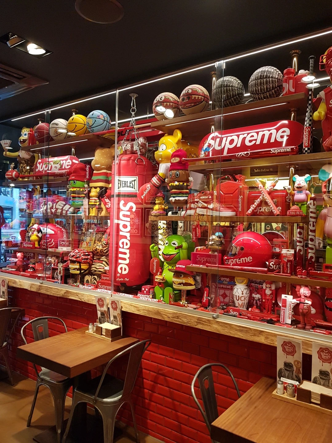 농구, 권투, 야구 등 다양한 스포츠 분야의 물품들이 나름 자신들만의 규칙으로 배열되어 있는 진열장을 보는 순간 입을 다물수 없었다. 이곳이 햄버거 가게인지 SUPREME 전시장인지 헷갈릴 정도로 빼곡히 자리 잡고 있는 소품 하나하나 놓치지 않고 눈에 담기 시작했다. 워낙 많은 소품들 덕분에 햄버거를 주문했다는 사실도 잊은 채 넋을 놓고 바라보고 있는데 카운터에서 다미의 햄버거가 나왔음을 알린다.