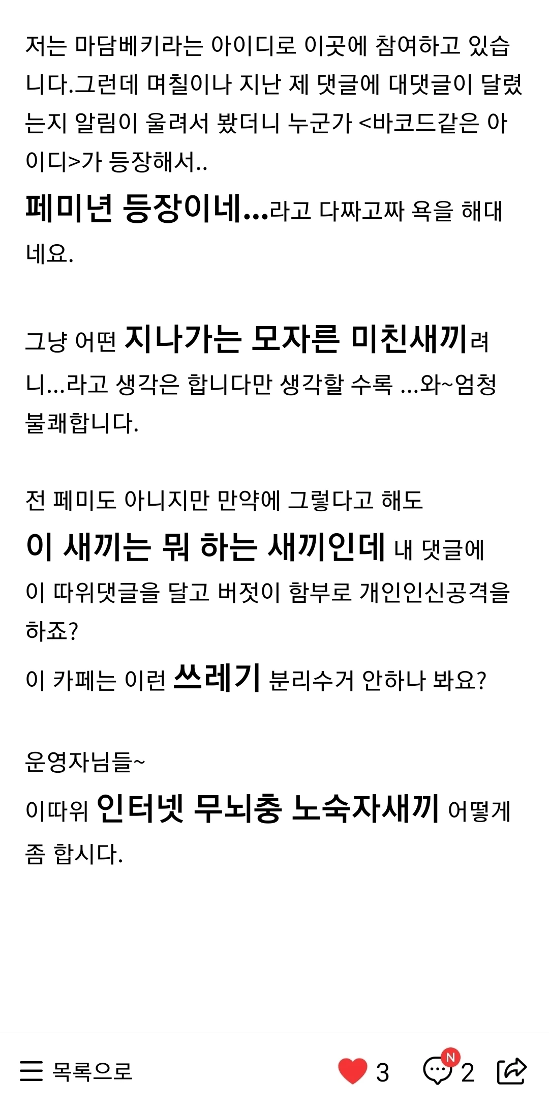 나를 페미니스트라고 여겨서 욕을 하는 것 같았다. 나는 페미니스트도 아니고 그런 거 잘 모른다.설령 내가 페미라고 해도 그게 욕 먹을 일인가? 지가 뭔데 나를 언제 봤다고 욕을하며 인신공격일까? 싶어서 엄청 불쾌했다.