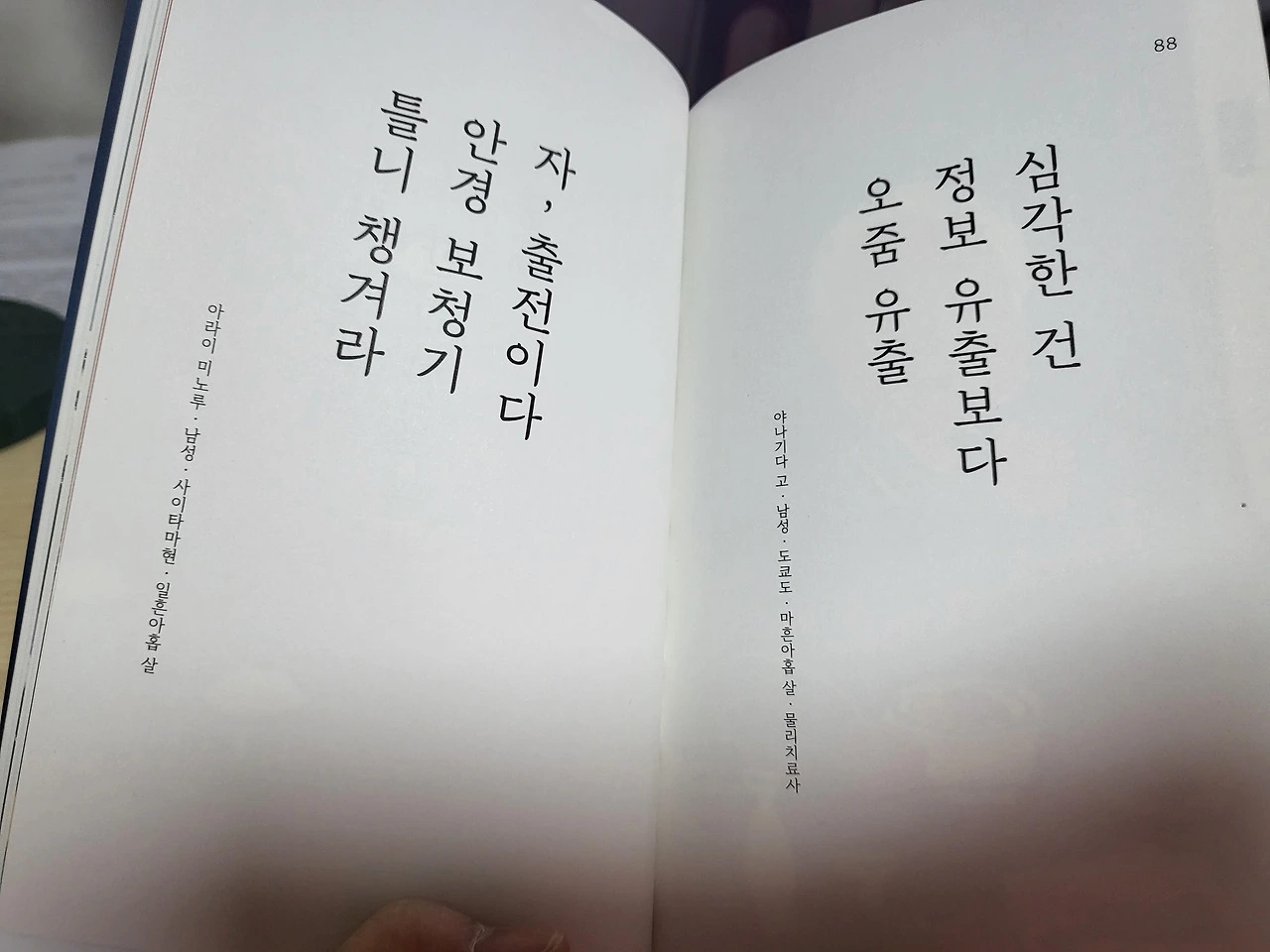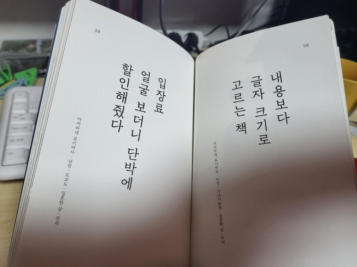 한 페이지에 한 줄이 대빵 큰 폰트로 적혀있는 책이지만 삶의 무게가 고스란히 느껴지는 묵직한 글모임이다. 엄마와 시부모 등 웃을 일이 많이 줄어드는 노인들에게 선물하고 싶다는 생각이 들었다.