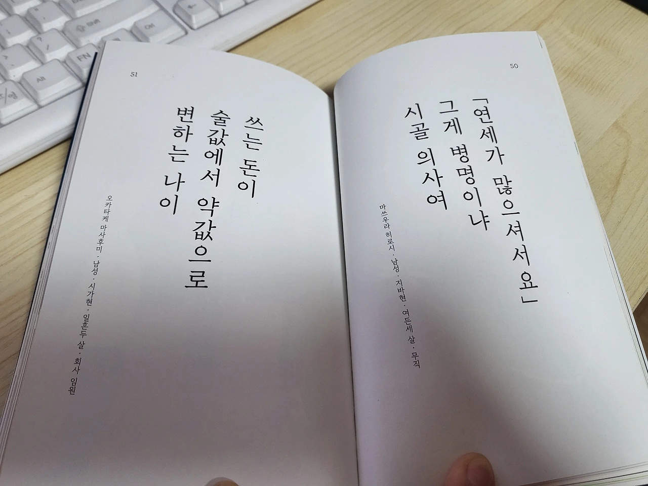 죽음에 누구보다 가까워 보이는 노인들의 위트 있는 센류를 모아 만든 이 책은 생각보다 유쾌하다. 말을 걸어주는 것 같은 멋진 책이다.