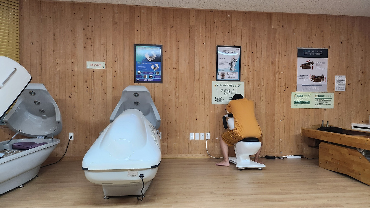 이곳에서 우리가 자주 했던 것은 건습식테라피. 1인당 5000원을 내면 인바디를 재주고, 혈관 나이를 측정한 후 안마의자, 골반마시지기, 장마사지기, 수압 마사지기 등을 비롯한 다양한 기구 사용을 할 수 있다. 마지막에는 족욕을 하고 샤워를 하거나 아니면 1인 히노끼 욕조에서 목욕까지 하고 갈 수 있다. 보통 동네 목욕탕 비용도 6000원이 넘는데 그보다 더 저렴한 비용으로 찌뿌둥한 몸을 풀고 가기에 너무 좋은 곳이었다.