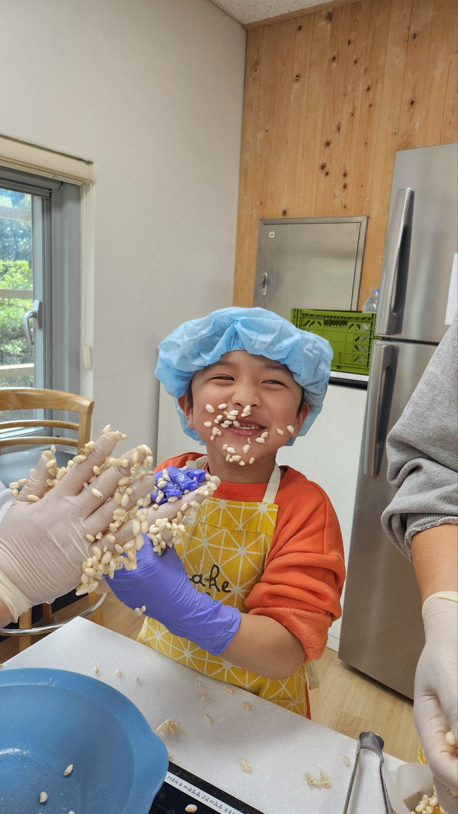 쿠킹클래스도 한 달에 한 번씩 열린다. 메뉴는 매달 바뀌는 듯하다. 우리가 갔던 달에는 쌀강정을 만들었는데, 어떤 달에는 오메기 떡 만들기를 하는 것을 봤다. 쌀강정을 만든 날, 아들의 경우 재료인 쌀튀밥을 만들기도 전에 많이 먹어서 입에 한가득 붙어 버렸는데, 흰 수염 같은 모습이 우습다며 요리를 도와주는 선생님들과 함께 웃기도 했다. 마치고선 바로 옆 어린이 도서관에서 한참 책을 읽다가 귀가했다. 비자숲힐링센터의 시간은 이처럼 유익하고 즐거웠던 기억으로 남아있다.