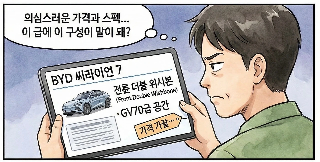 그 과정에서 BYD의 씨라이언 7을 보게 됐다. 처음부터 호감이 있었던 건 아니었다. 솔직히 말하면, 반신반의였다. 중국 브랜드라는 점도 그랬고, 가격표를 봤을 때 가장 먼저 든 생각은 “이 가격에 이 구성이 말이 되나?”였다. 의심이 먼저 들었다는 말이 더 정확하다. 그래서 더 꼼꼼하게 봤다. 크기, 플랫폼, 서스펜션 구조, 배터리 구성, ADAS 사양을 하나씩 뜯어봤다.