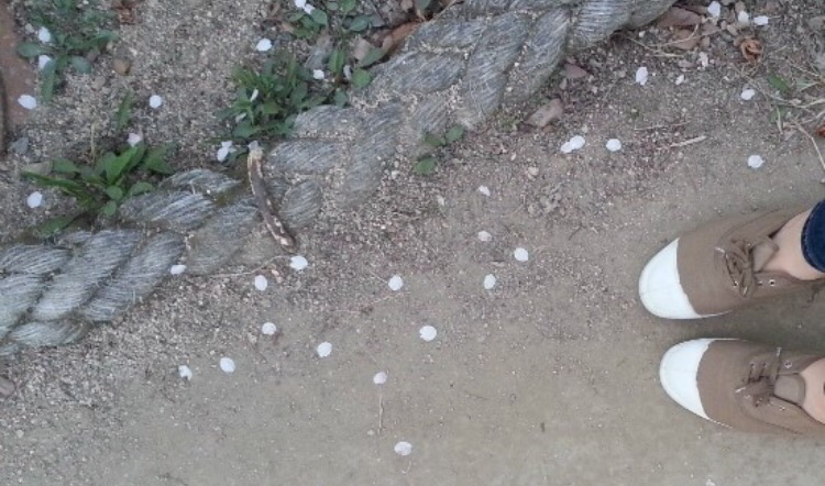 발밑에 수많은 벚꽃들이 자리 잡고 있다.