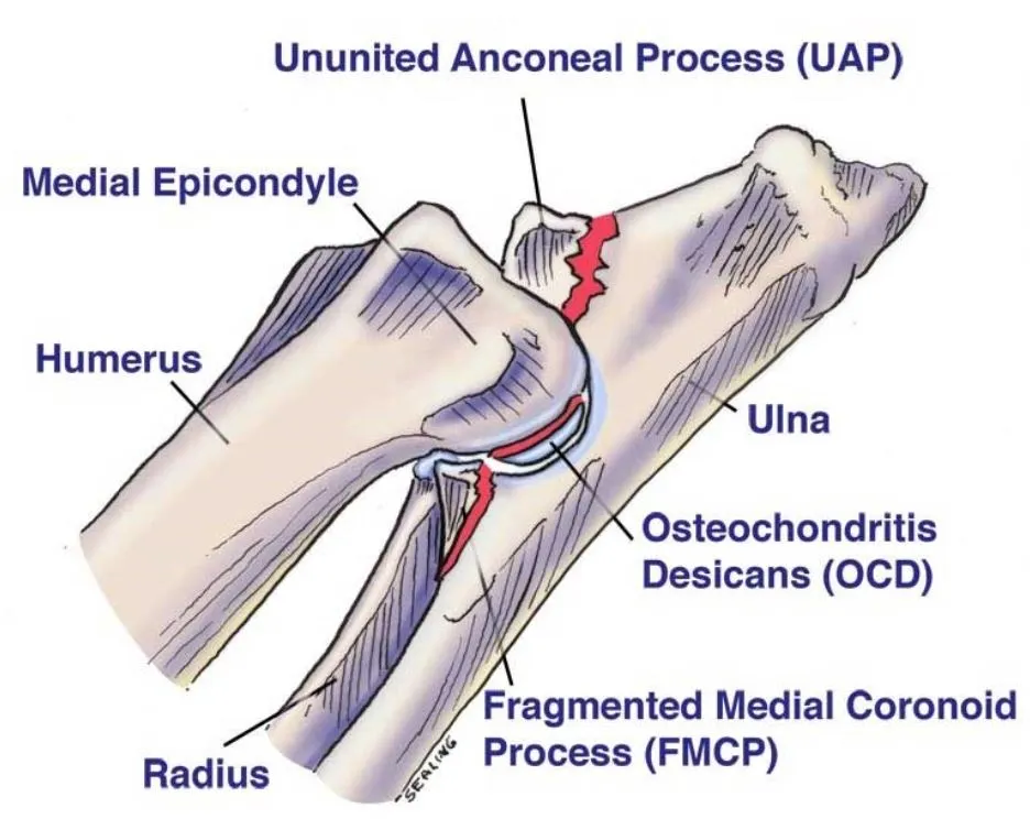 UAP(United Anconeal Process)는 강아지의 앞다리에 발생하는 "팔꿈치 이형성증"인데요. 팔꿈치 이형성증은 앞다리 뼈의 성장이 정상적으로 이뤄지지 않아서 발생하는데, 유합이 되어야 하는 뼈들이 분리된 상태로 있게 되면서 강아지가 걷는데 불편함을 느끼는 질병이었어요. 이 뼈들이 정상적으로 성장한다면, Anconeal Process는 생후 20주 전에 다리뼈에 붙는 게 일반적이라고 해요. 하지만 UAP를 겪는 강아지들은 갑자기 성장하면서 이러한 과정이 이행되지 못하고 걸을 때마다 통증을 느끼게 되는 거였어요. 이런 증상은 보통 수컷 강아지, 대형 강아지에게서 많이 발생하고, 생후 5-9개월 사이에 발견된다고 해요(참고 1).