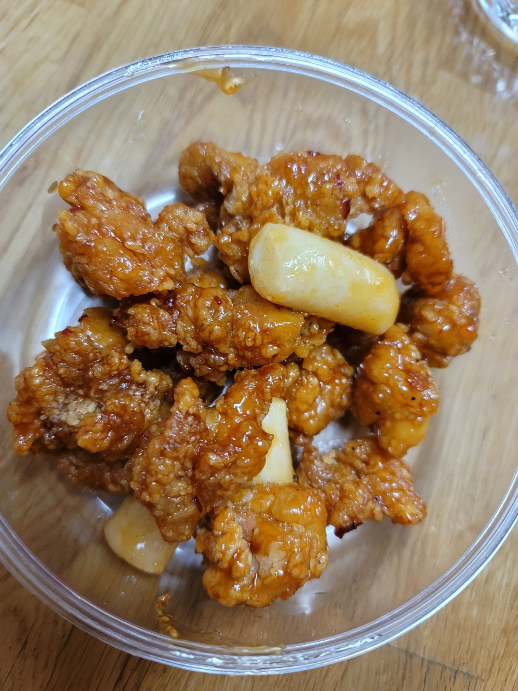 그렇게 돌아오는 길에 사 온 닭강정. 집에 도착하자마자 동생이 그릇에 닭강정 몇 개를 덜어준다.