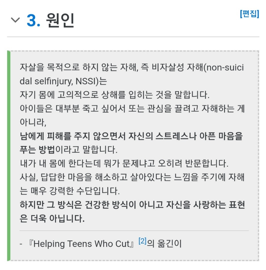 나무위키에서 자해 관련 정보를 검색해 봤어요. 자해는