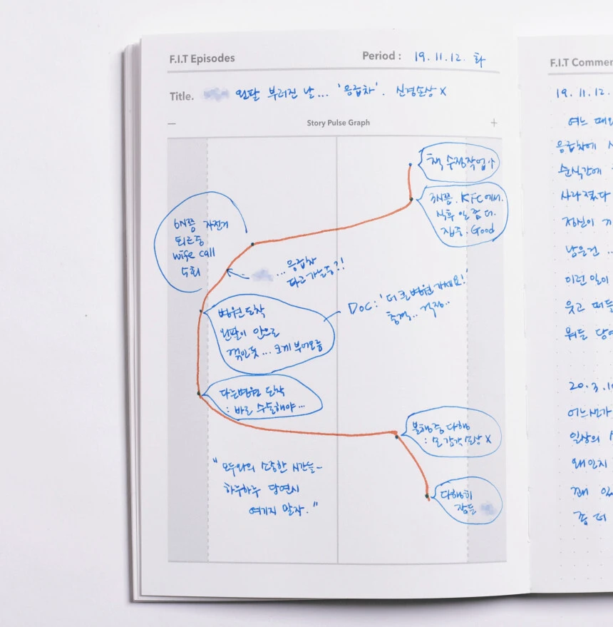 3년 전 경험담입니다. 저희 집 첫째(당시 어린이집 6살)가 팔이 골절되는 사건을 이야기 그래프(나만의 역사를 그래프로-이야기 맥박 그래프)로 그려본 것입니다. 먼저는 이 사건에 중요하다고 생각하는 사실들(말풍선)만 추렸습니다. 위 문장에서 말하는 '의미있는 사실들'이겠습니다. 그리고 그것을 시간 순서대로 엮었습니다(그래프 선). 마지막으로 이 일을 통해 제가 느낀 것, 즉, 이 사건이 바꾼 나의 생각, 감정의 변화를 간단히 문장으로 써봤습니다.