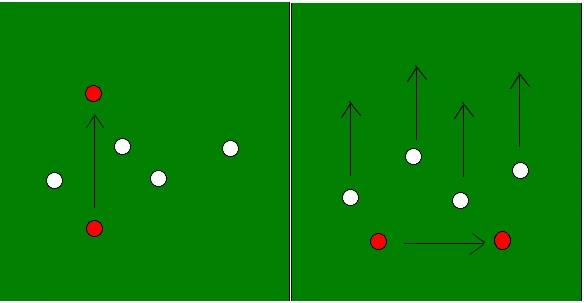 <횡패스는 패스가 이루어지는 동안 상대가 수비진영으로 복귀할 시간을 내어주게된다.>