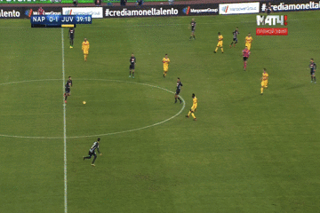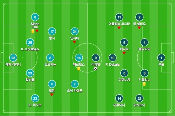 여기서 나폴리의 한계가 드러났습니다. 메르텐스, 인시녜, 함식의 짧은 패스 플레이가 통하지 않자 공격의 방향성을 잃은 모습이었죠. 유벤투스 압박으로 중앙에서 볼을 소유할 수 없게 되자 측면으로 볼을 돌려 페널티박스 안으로 크로스를 올렸는데, 공격수들의 신장이 작은 탓에 대부분의 공격이 무의미하게 흘러갔습니다.