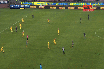 여기서 가장 중요한 포인트는 양 측면에 배치된 마투이디와 더글라스 코스타가 측면을 넓게 커버해줬다는 겁니다. 나폴리의 풀백이 수비를 분산시키기 위해 측면으로 넓게 움직였을 때, 마투이디와 더글라스 코스타가 측면 수비를 담당해줬기 때문에 유벤투스 수비진은 나폴리 풀백의 오버래핑에 흔들리지 않고 중앙을 두텁게 만들 수 있었습니다. 유벤투스의 밀집된 수비가 흔들림 없이 유지되자 나폴리의 짧은 패스 플레이는 위력을 발휘할 수 없었죠.