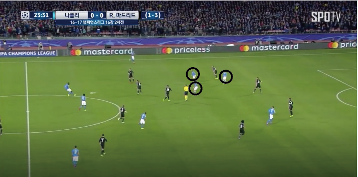 (왼쪽 중앙 지역에서 메르텐스, 인시녜, 함식의 패스 플레이로 수비를 무너뜨리거나, 반대편에서 쇄도하는 카예혼을 향해 한번에 넘겨주는 패스가 나폴리의 주된 공격패턴이죠.)