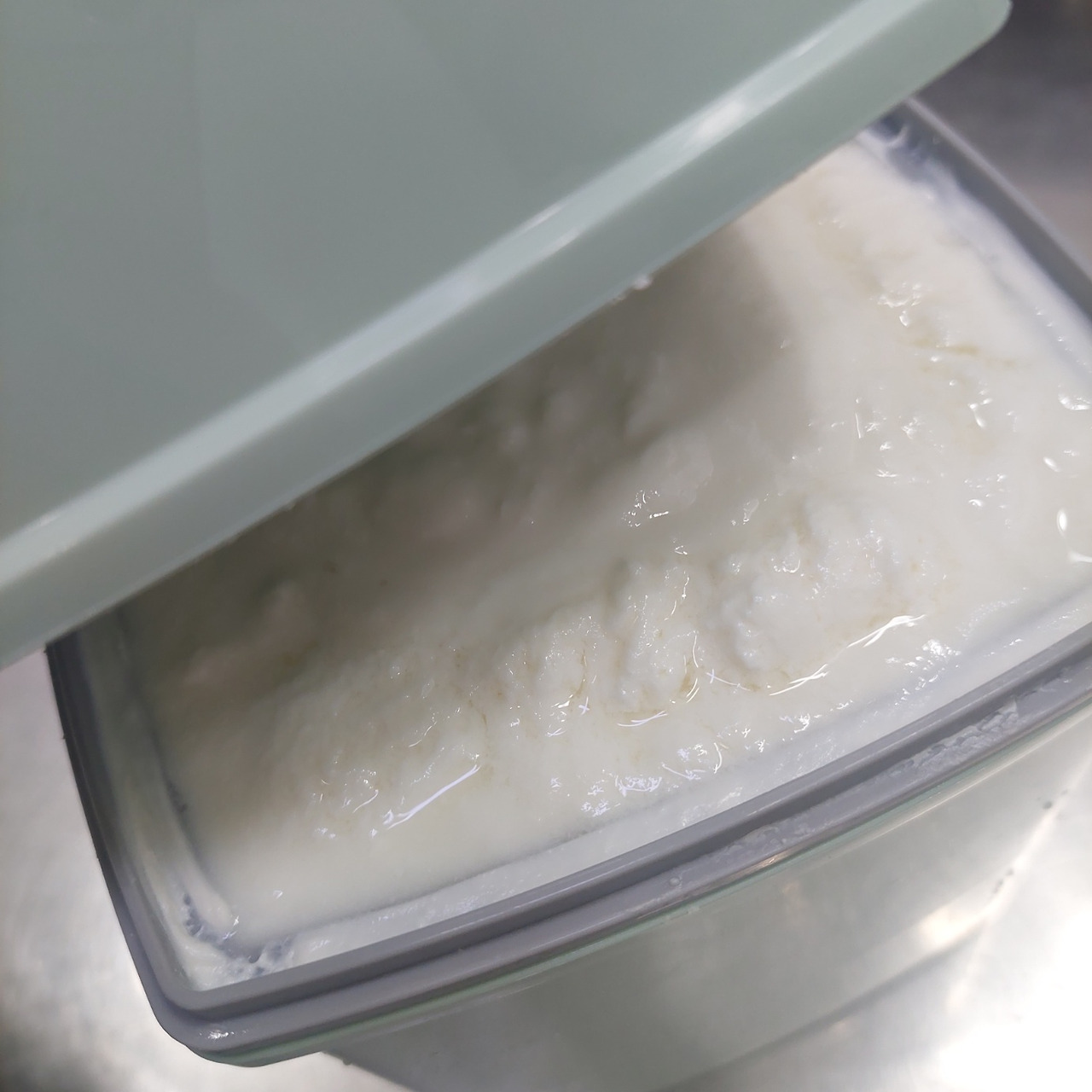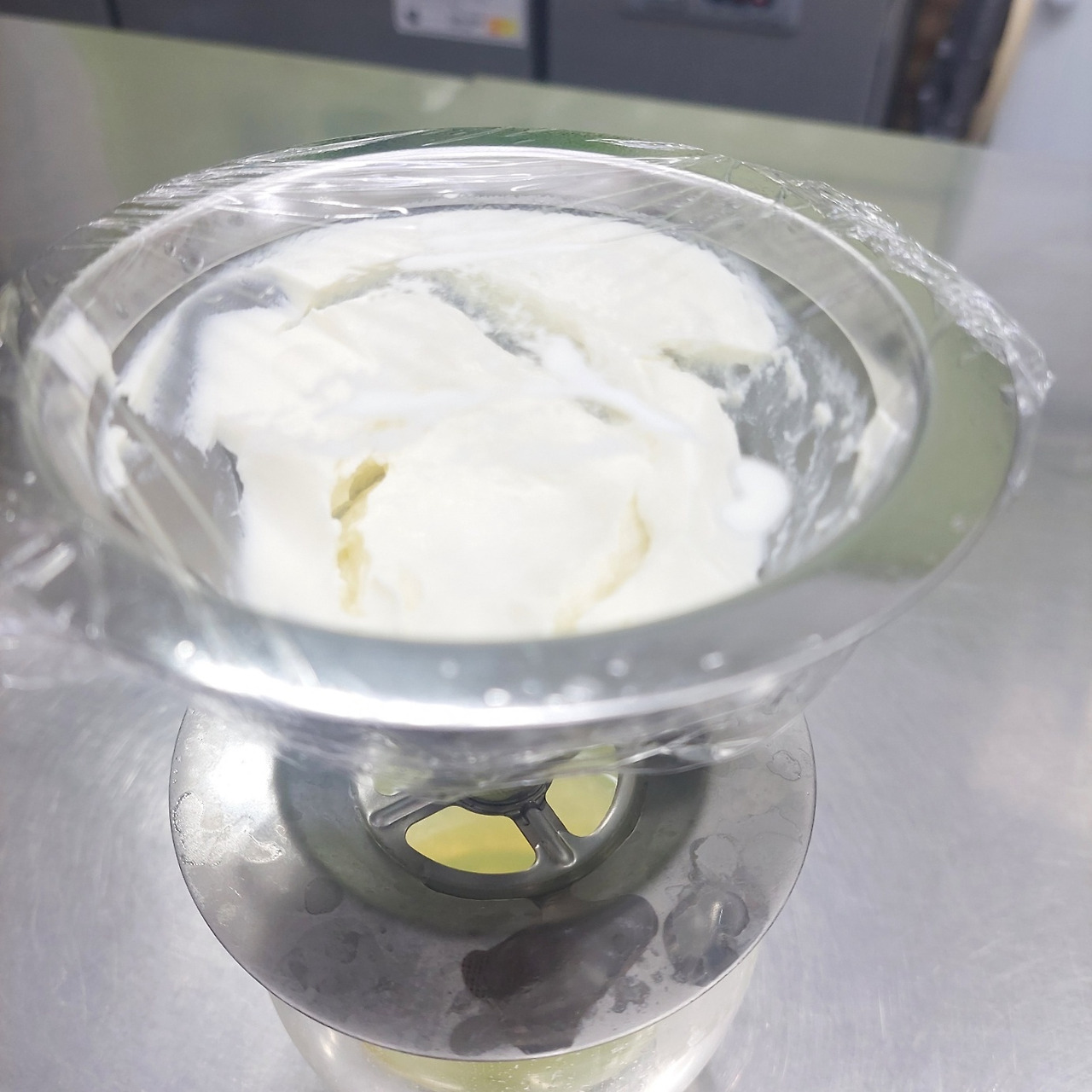 플레인 요구르트의 수분인 유청이 분리되는 과정이다.꽤 많은 유청이 나온다.