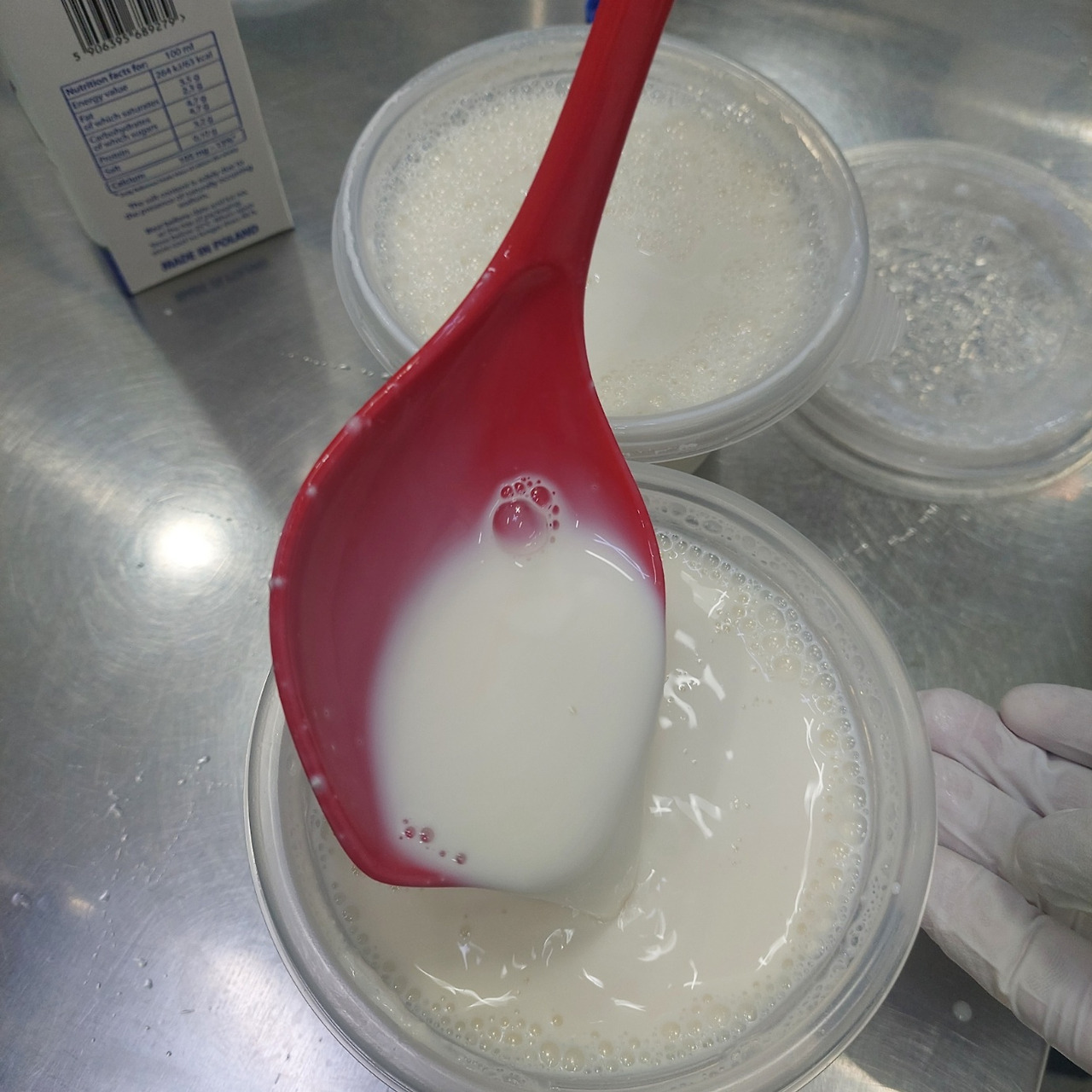 1. 우유를 450ml씩 넓적한 두 통에 넣는다.