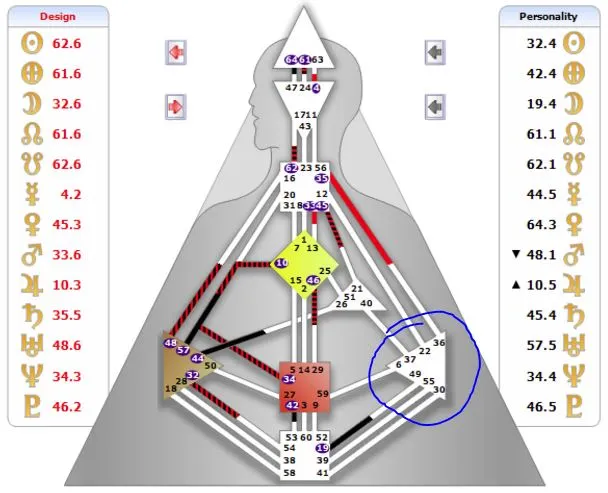 파란 동그라미 이곳이 감정센터(태양신경총)인데, 나는 관문이 단 한 개도 정의되어 있지 않는 오픈 감정 센터이다. 나는 매우 차분하며 감정적 변동이 없이 매우 냉랭한 사람처럼 보일 때도 있다.