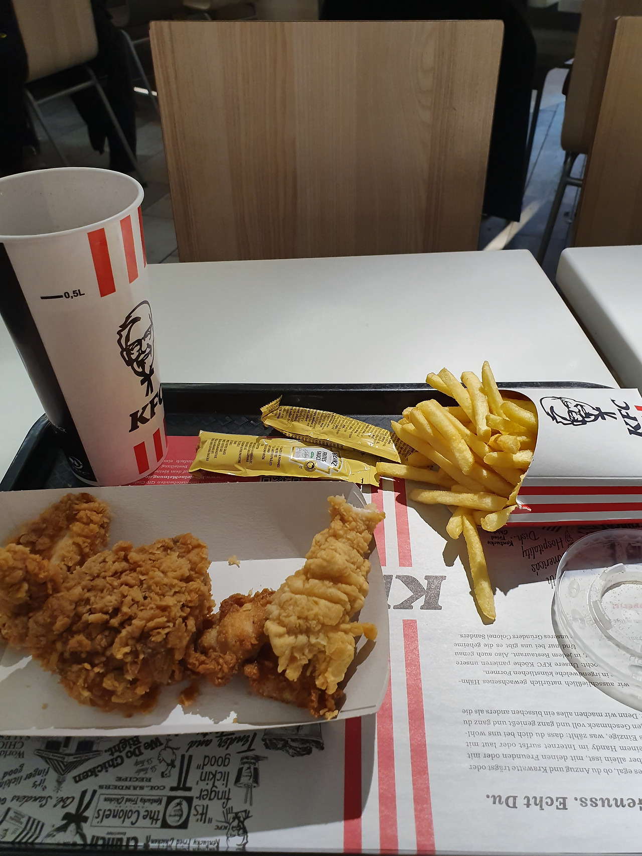 말해 뭐하리, 조용히 내 앞에 툭 떨어진 종이를 주워서 조금 기다리다 음식을 받아 자리에 앉았다. 한 입 베어문 치킨도 실망시키지 않았다. 겉 튀김옷은 눅눅한데 속은 느끼하고 퍽퍽했다. 한국 치킨이 맛있다는 이야기는 하도 들어 그런가보다 했는데 설마 외국 KFC가 이 정도로 맛없을 줄은 몰랐지 뭔가. 한국에는 맛있는 치킨 브랜드, 개인 치킨집들도 많고 KFC도 점포가 많지는 않지만 그 중에서 그래도 살아남고 있을 정도의 맛과 퀄리티를 유지하고 있다. 엄청난 변주까지는 없더라도 겉바속촉이라는 치킨의 기본기는 충실하게 지키고, 어느정도 팬층이 있을 정도의 맛인데 뮌헨 KFC는 충격적이었다.