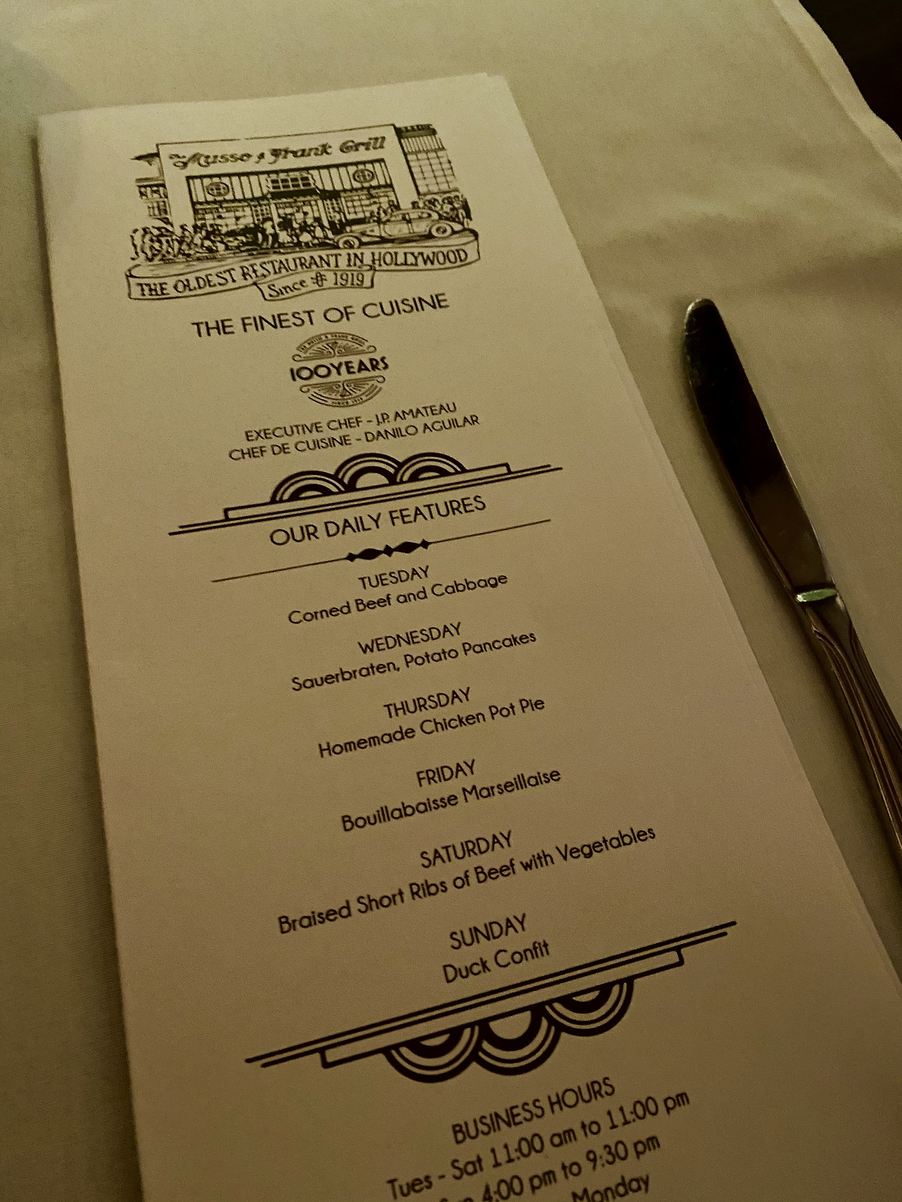 우리의 로드트립 마지막 저녁은 100년 된 Musso & Frank에서 피날레를 장식하기로 했다. 할리우드에 위치한 이 레스토랑은 찰리 채플린부터 시작해 지금도 수많은 할리우드 스타들이 찾는 단골 집이다. 'Once upon a time in Hollywood'같은 영화에도 자주 등장한다. 피날레 디너답게 레스토랑 문을 열고 들어오자 정말 Once upon a time in Hollywood에 온 것만 같았다.