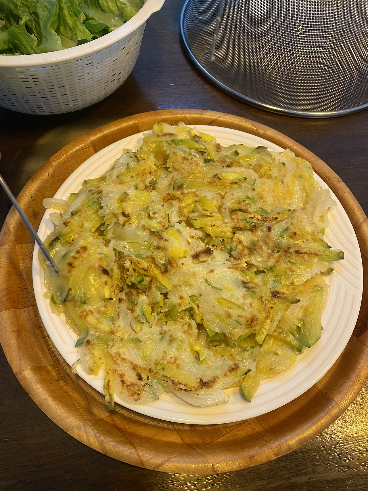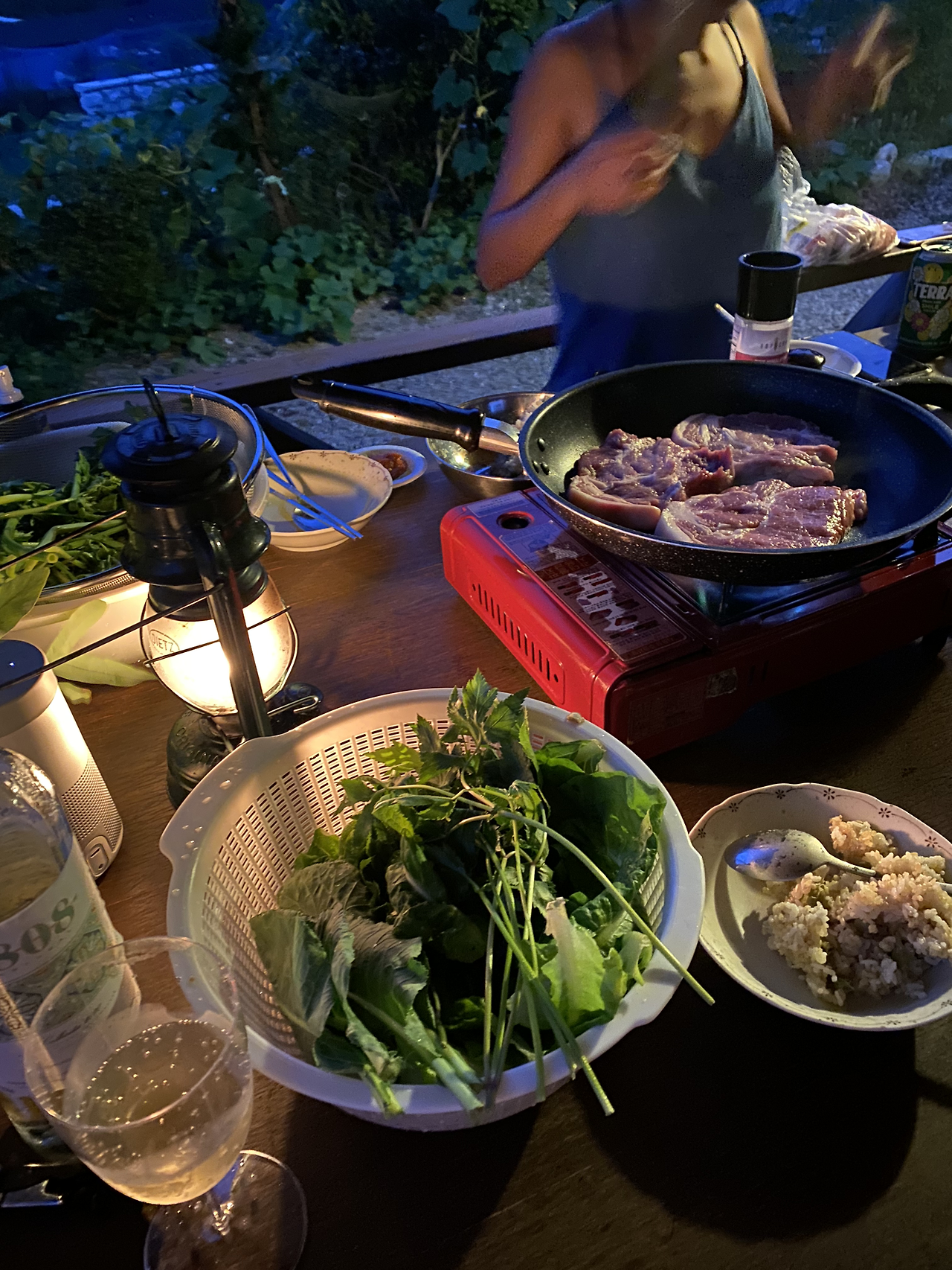 어두워지기 시작할 무렵, 집으로 돌아왔다. 긴 물놀이로 허기가 졌는데 마침 선생님 어머니가 청양고추가 들어간 호박전을 만들어주셨다. 긴 물놀이 끝에 먹는 전이라 특별히 더 맛있었다. 전으로 허기를 달래고, 큰 거실 방에 모여 가볍게 요가 수련을 했다. 수련을 마치고는 바비큐를 하고, 같이 온 분들과 이런저런 이야기를 나누며 밤이 저물었다.
