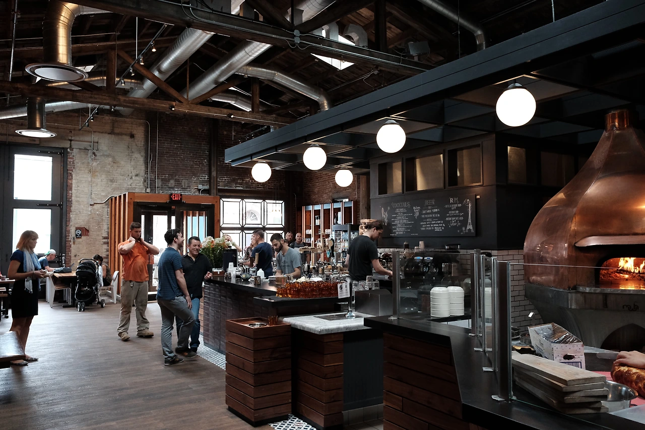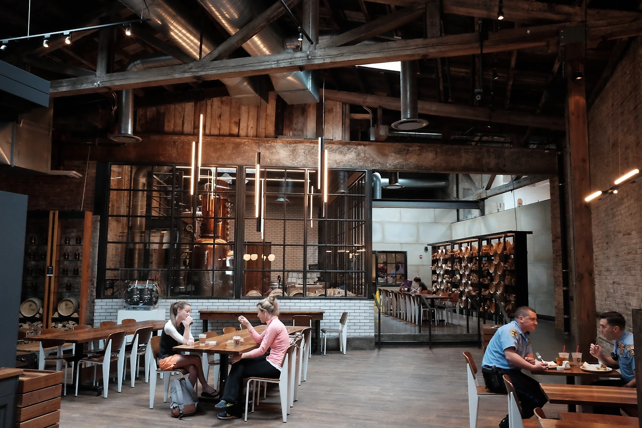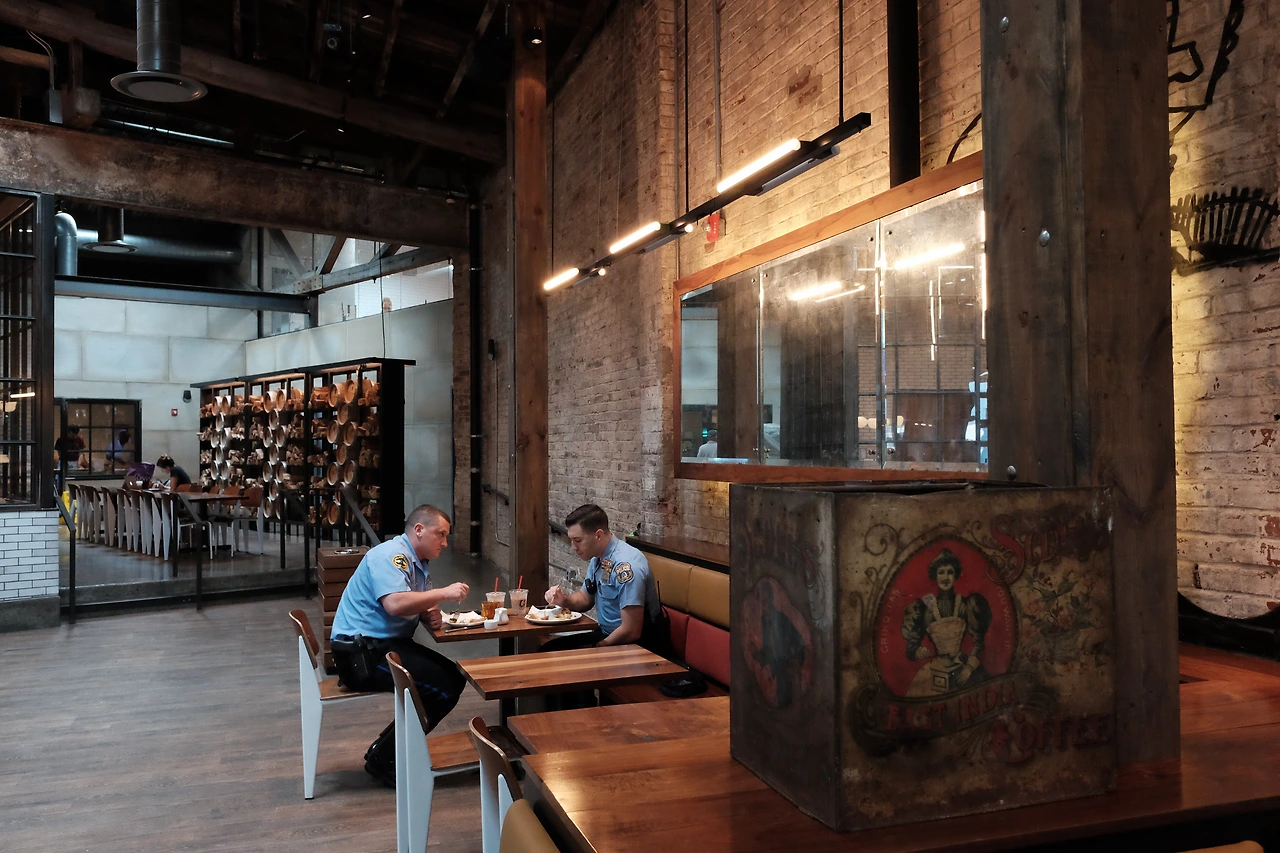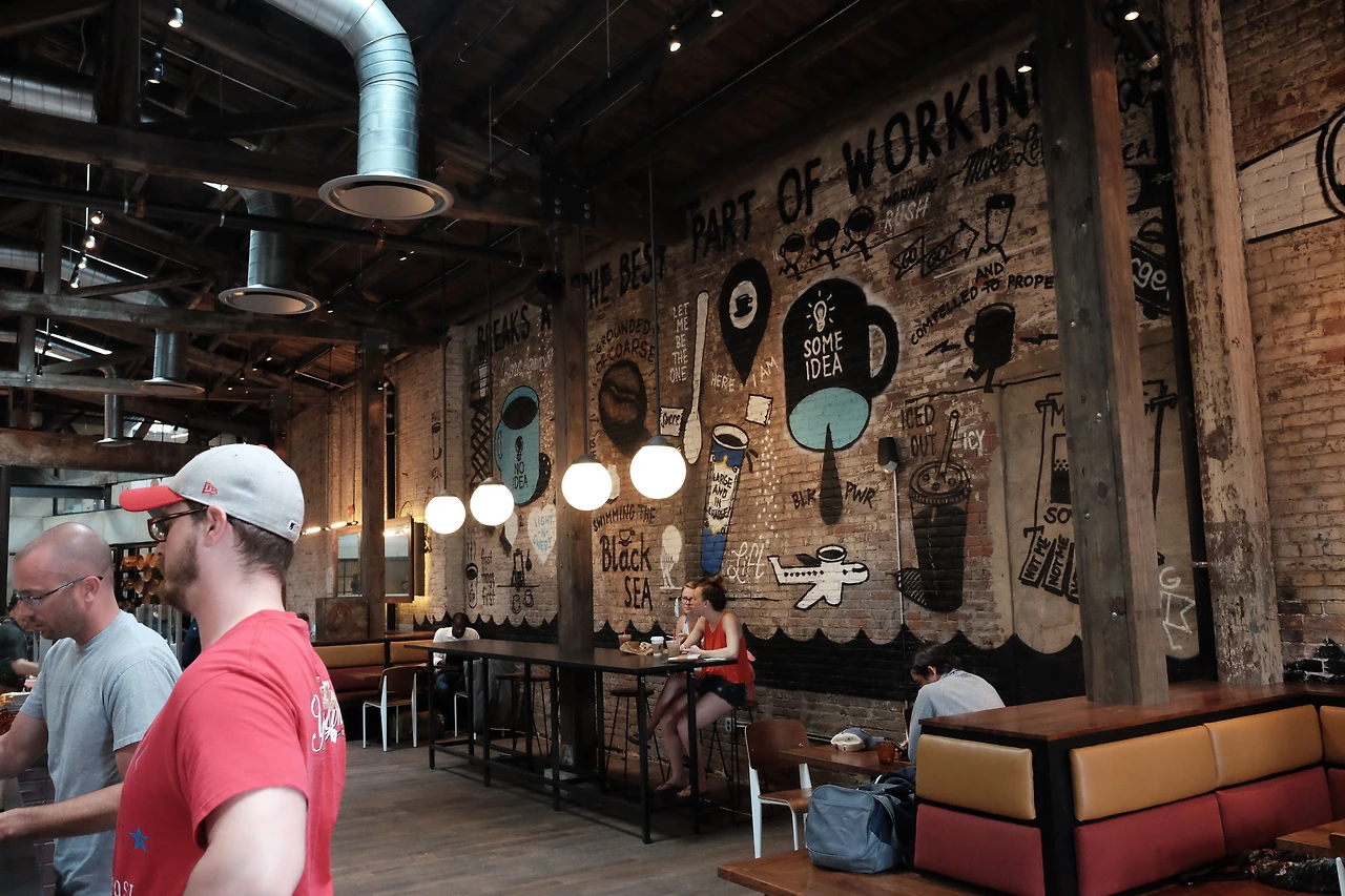 우리가 갔던 라 콜롬브 매장이 위치해있는 필라델피아 피시 타운은 원래 가난하고 개발이 잘 안된 지역이었으나 싼 임대료 등으로 아티스트들이 많이 이주하면서 젠트리피케이션이 심해진 동네라고 했다. 그래서인지 젊은 사람들이 좋아할 만한 빈티지샵, 바, 레스토랑 등과 같은 곳들이 많이 몰려있었다. 큰 공장 같은걸 개조해 만든 것 같은 피시 타운 라 콜롬브 매장은 높은 목조 구조의 천정에 오래된 붉은 벽돌 위에 새겨진 아기자기한 벽화 등 탁 트인 공간이 너무나 마음에 드는 곳이었다.