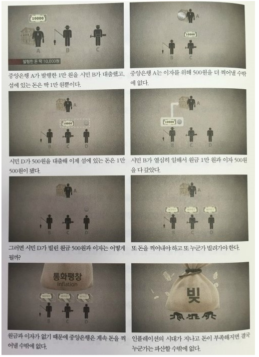 나를 포함한 무지한 사람들은 돈에 대해, 그리고 빚에 대해 너무도 순진하게 생각해 왔다. '빚지지 말아야 한다'는 이야기를 귀에 못이 박히게 들어왔지만 아이러니하게도 우리가 살아가는 사회는 빚이 있어야만 굴러갈 수 있다. 자본주의에서 돈이 있는 사람들은 이 '빚'때문에 더 많은 돈을 벌고, 돈이 없는 사람들은 바로 이것 때문에 파멸에 이른다.