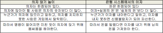 화폐경제 역사 연구가 앤드류 가우스는 이것을 '의자 앉기 놀이'에 비유한다.