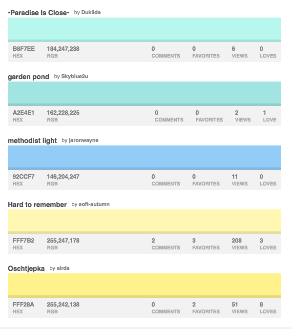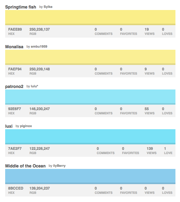 우리의 기억을 담은 최상의 컬러를 찾기 위해서, 다양한 컬러차트를 보여주는 사이트(http://www.colourlovers.com/)에서 'Summer' 'Ocean' 'Boardwalk'등과 같은 키워드로 검색을 하며 다양한 컬러차트를 저장한 뒤에 여러 가지 색깔을 비교하며 최종적으로 3가지 컬러 조합에 동의하게 되었다.