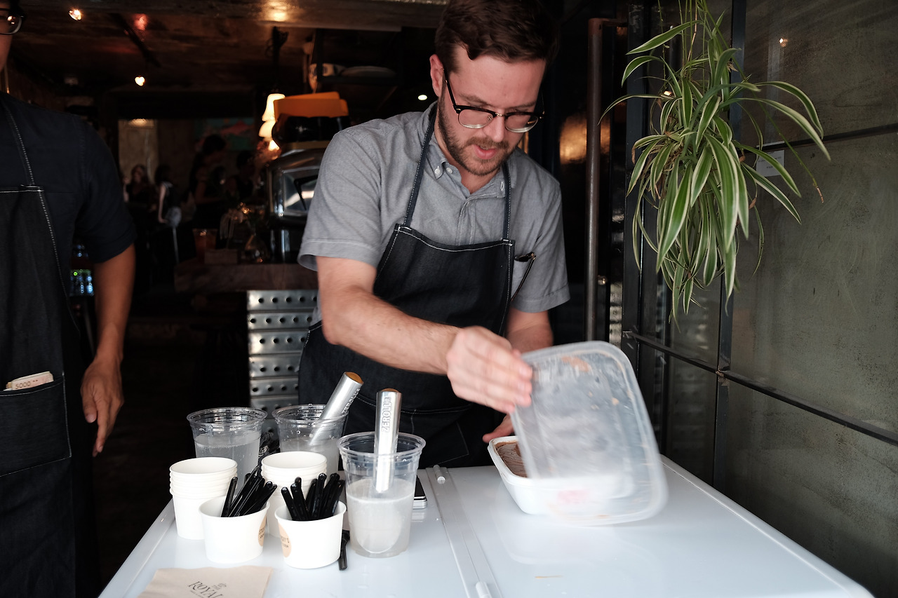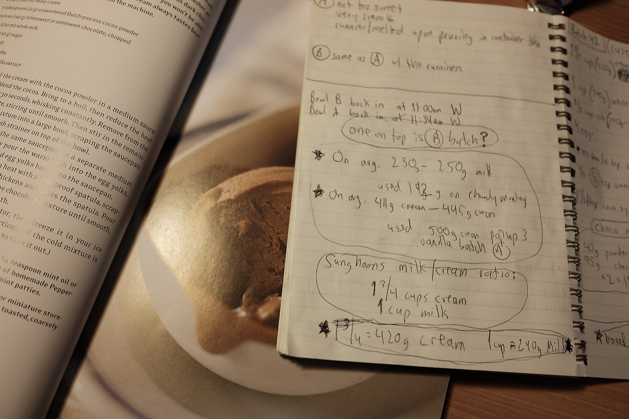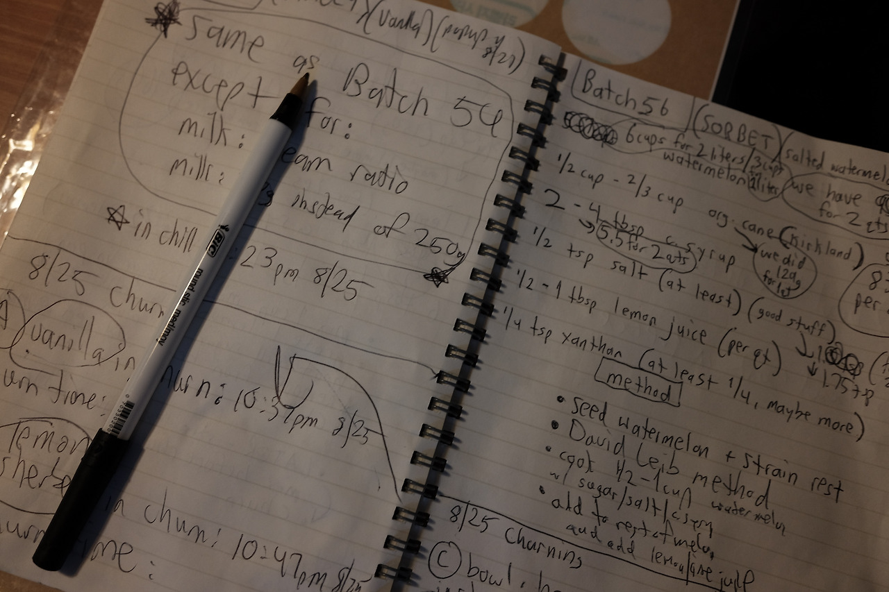 콘셉트와 메뉴 구성이 끝나고 난 2번째 주는 재료를 구하고 레시피를 개발하는데 시간을 보냈다. 어느 정도의 조합으로 재료들을 배합할지, 어떤 베이스에 어떤 과일 맛을 조합할지 등 촘촘하게 레시피가 짜이고 나면 팝업이 있기 전날까지는 매일매일 새로운 배치의 아이스크림을 만든다. 사용하는 기계가 상업용 아이스크림 기계가 아닌 가정용 기계다 보니 한 번에 만들 수 있는 양이 한정적이라 두세 번을 나누어 아이스크림을 만들고 이때 배치마다 아이스크림 맛이 달라지지 않도록 세심한 주의를 기울여야 했다.