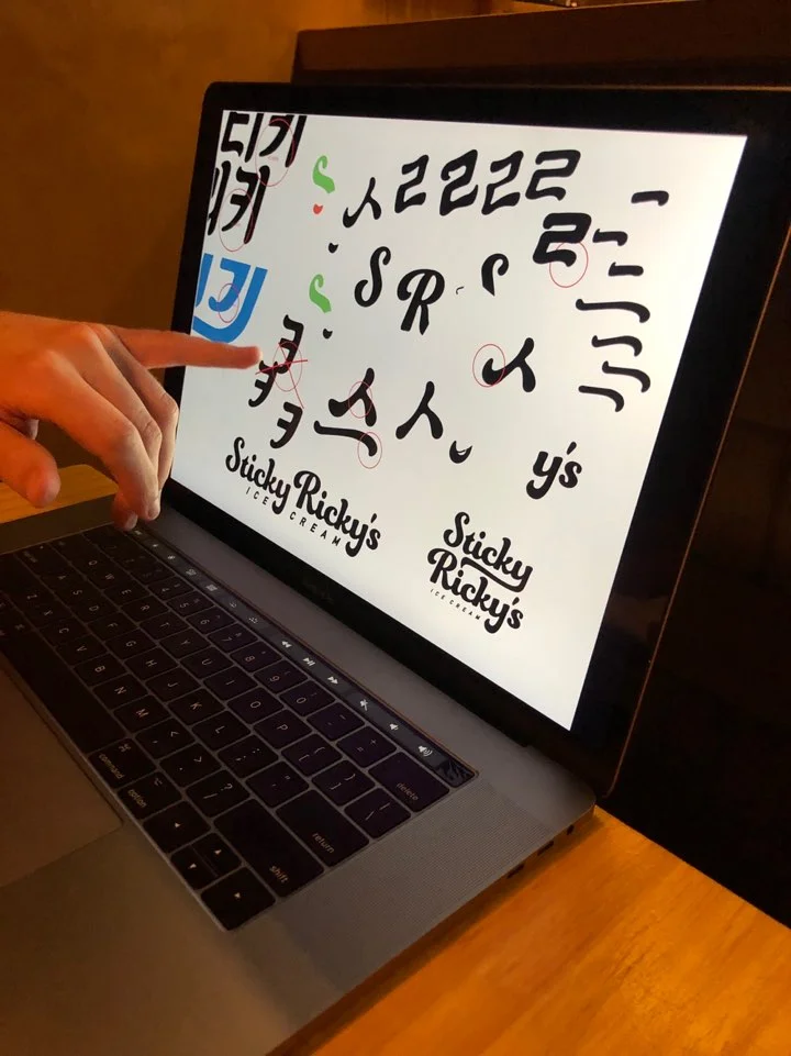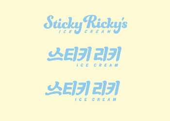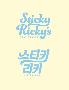 이질감 없는 한글 로고를 위해 케빈과 우리가 생각한 전략은 스티키리키 영문 로고의 가장 큰 특징인 S, R, Y의 커브들을 따서 국문에 적용을 시키는 방법이었다. 예를 들어 Sticky Ricky’s에서 S에 들어가 있는 끝쪽 커버를 따와 스티키 리키 한글의 ‘ㅅ’와 ‘ㅡ’에 적용시키고, y에 있는 커브를 따서 ‘ㅋ’의 커브를 만들어 영문과 한글의 느낌이 최대한 동일하도록 만들었다.