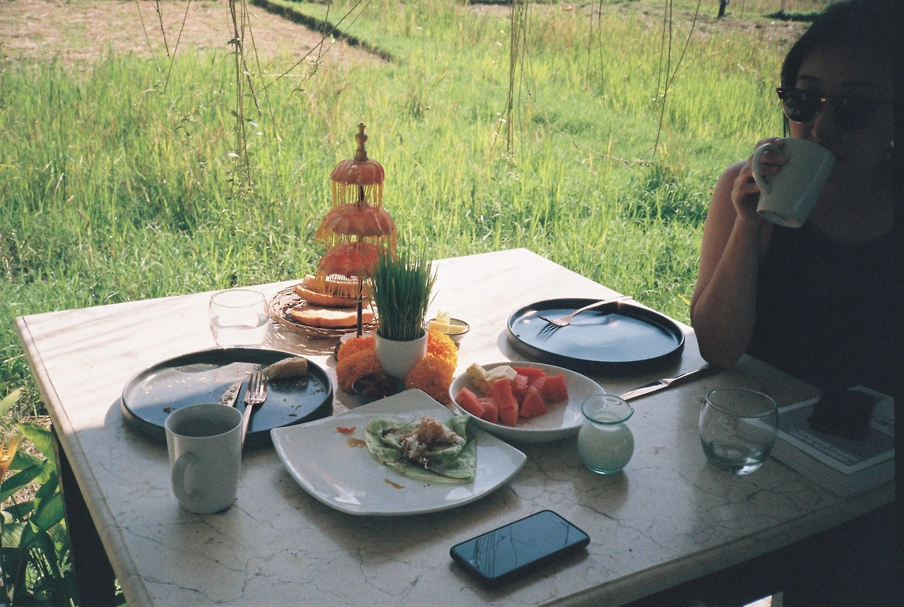 대충 옷만 껴입고 조식을 먹으러 갔다. 조식 역시나 범상치 않았다. 외부 키친이라 화려한 햇살을 그대로 받고 사방으로 초록빛으로 둘러진 자리에서 우리는 조식을 먹었다. 아침밥을 먹지 않아 따뜻한 커피 한잔으로 시작했다. 은희와 밥을 먹고 있는데 땅에 닿은 은희의 로브가 흔들리기 시작했다. 숙소 고양이가 은희 로브를 장난감으로 생각하고 이리저리 장난을 쳤다. 은희가 로브를 걷어 올려 피하자 고양이는 이내 은희 의자 위로 껑충 올라왔다. 귀여운 아침 맞이이다.