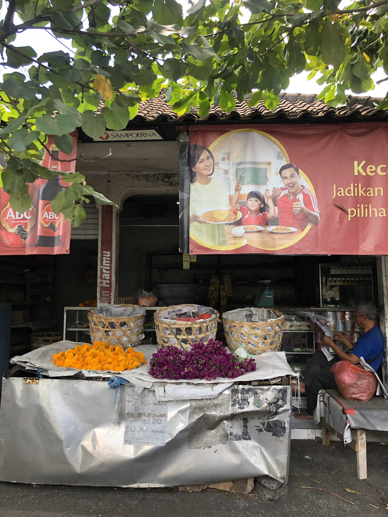 차창으로 지나가는 풍경에서 메리골드 꽃을 파는 작은 상점들과, 꽃 바구니를 한 아름 들고 가는 사람들을 마주칠 수 있었다. 발리에서는 사원이나 카페의 계단에도, 요가원이나 누군가의 집 앞에도, 택시나 들판에서도 어딜 가나 주황색 메리골드 꽃을 만날 수 있었는데, 신에 대한 발리 사람들의 경배와 정성을 엿볼 수 있었던 이 주황색 꽃이 나에게는 발리의 상징으로 기억이 될 것 같았다.