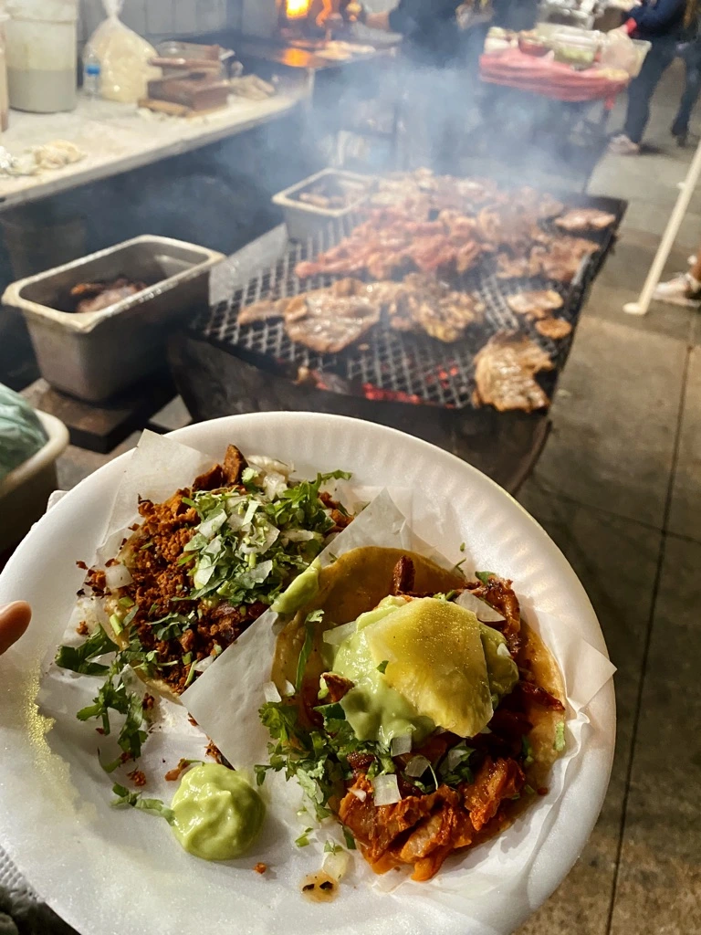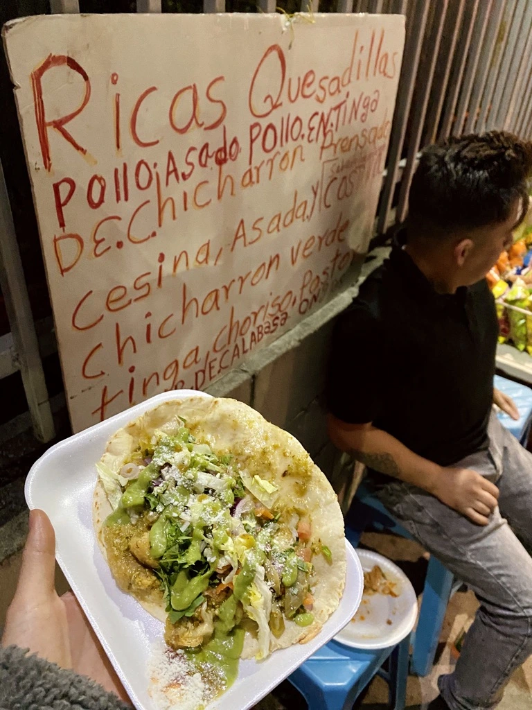 그리고 다시 2차 타코 스탠드로 옮겼다. 나이 드신 할머니와 할아버지가 좌판을 깔아 두고 하는 타코 스탠드였는데, 야간 일을 마친 분들이 플라스틱 의자에 앉아서 맛있게 타코를 드시고 계셨다. 우리도 옆 의자에 함께 앉았다. 나는 포크 벨리에 그린 소스가 얹어진 Chicarron verde를 시켰다.