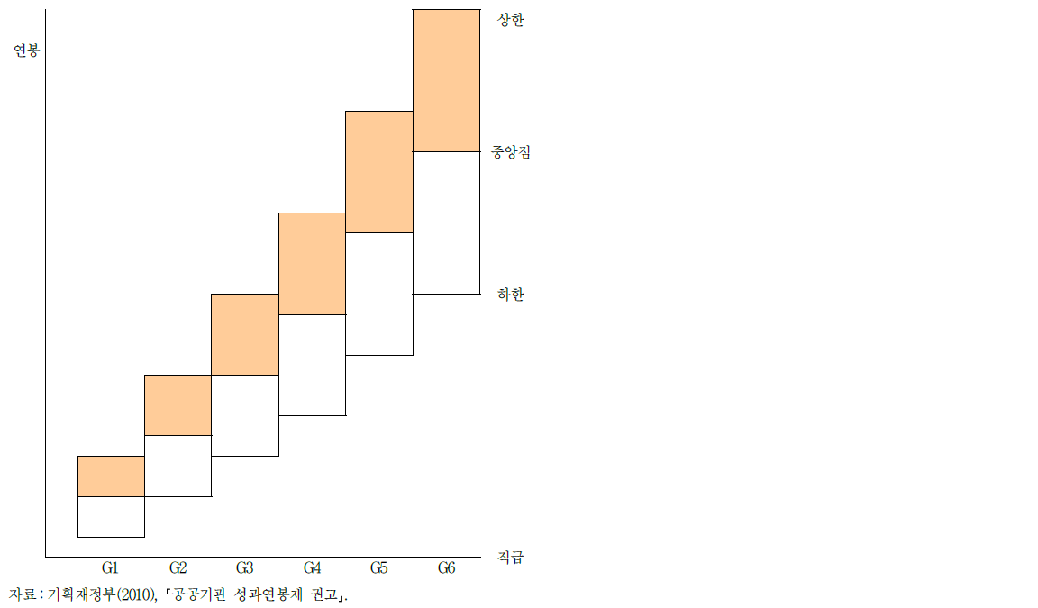 아래와 같이 직급별 Pay band를 설정해서 기본급 (연봉)과 성과급을 함께 혼합하여 사용하는 방식이 일반적이다.