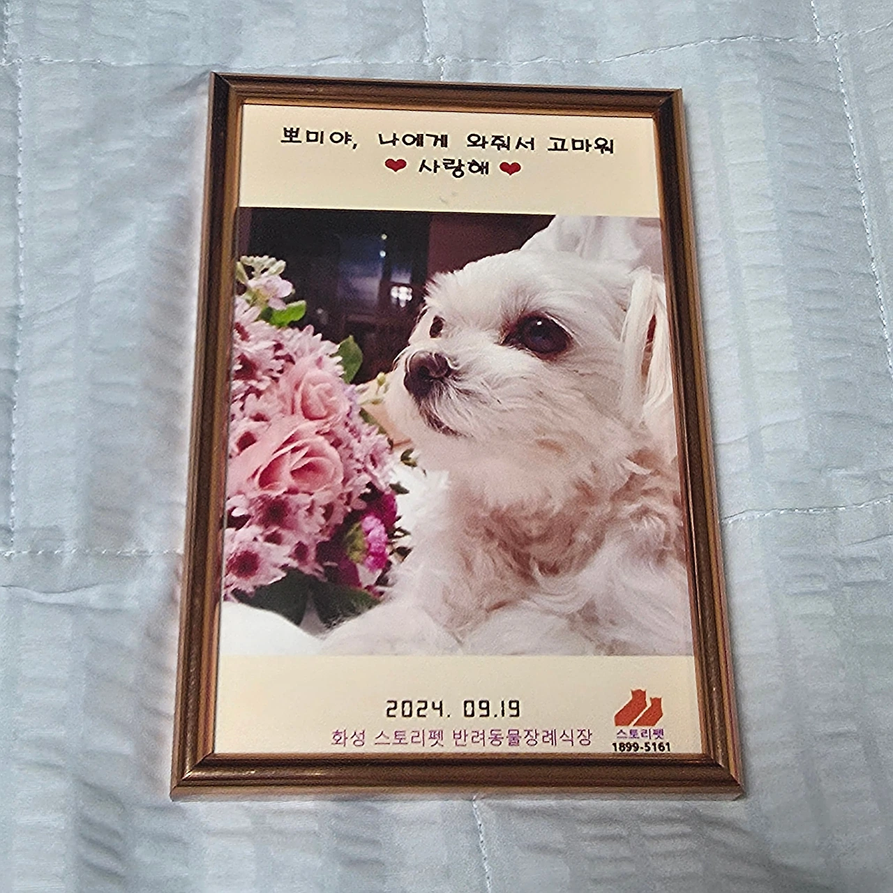 언니가 뽀미 몫까지 많이 울고 그리워할 테니 너는 좋은 곳에서 행복하게만 지내고 있어. 언니도 언니한테 주어진 시간이 다 끝나고 나면 꼭 뽀미 찾아갈게. 부족한 나한테 와줘서 고마웠고, 부족한 나라도 사랑해줘서 행복했고, 눈치 빠른 강아지 끝까지 효녀라서 언니가 많이 미안해.
