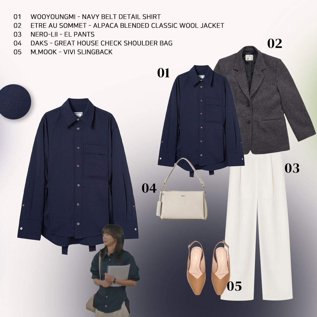 딥 네이비 컬러, 베이직 디자인 셔츠로 ‘CAREER WOMAN’의 직업적 성격을 강조하고, ‘WAIST STRING’으로 포인트를 더해 심심하지 않게 완성했다. 특히, 극중 인물이 일에 우선순위를 부여하는 면모를 적합하게 반영했다. 셔츠 색감도 당시 계절이였던 가을과 잘 어울린다.