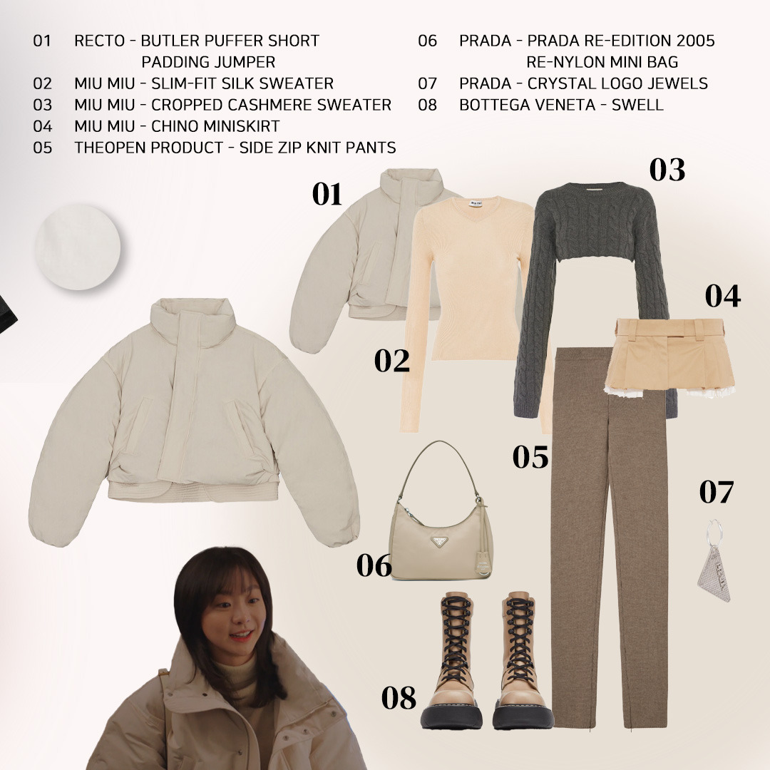 패딩은 웜 컬러로 인물 감정에 사랑이 ON 상태인 것을 담았으며 숏 패딩에 22 트렌드를 가미해, ‘Y2K 룩’을 제안했다. 상의는 ‘CROPPED’, 하의는 ‘LOW RISE’로 Y2K를 반영했고, 이너, 니트 팬츠로 2000년대 패션을 재해석했다. 이어링은 ‘BOLD&SLIVER’, 백은 ‘MINI&HOBO’, 슈즈는 베이직 형태를 선택하면서 Y2K를 색다르게 해석했다.