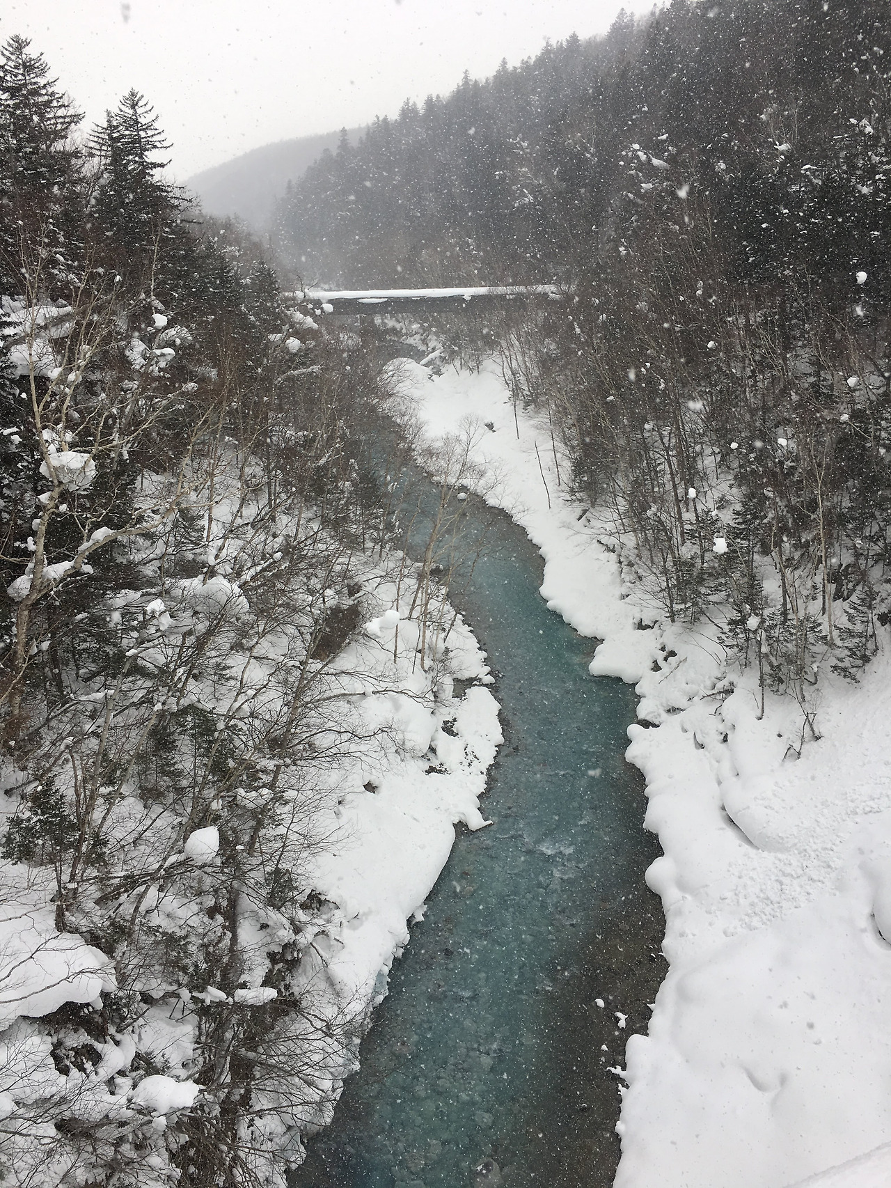 시로가네 폭포. 와.. 여기가 진짜 장관이었다. 흐르는 물 색깔이 파란 것도 신기하고 얼음이 파란 것도 신기하고, 폭포가 생각보다 예뻤다! 눈도 기분 좋게 흩날려서 좋았다.