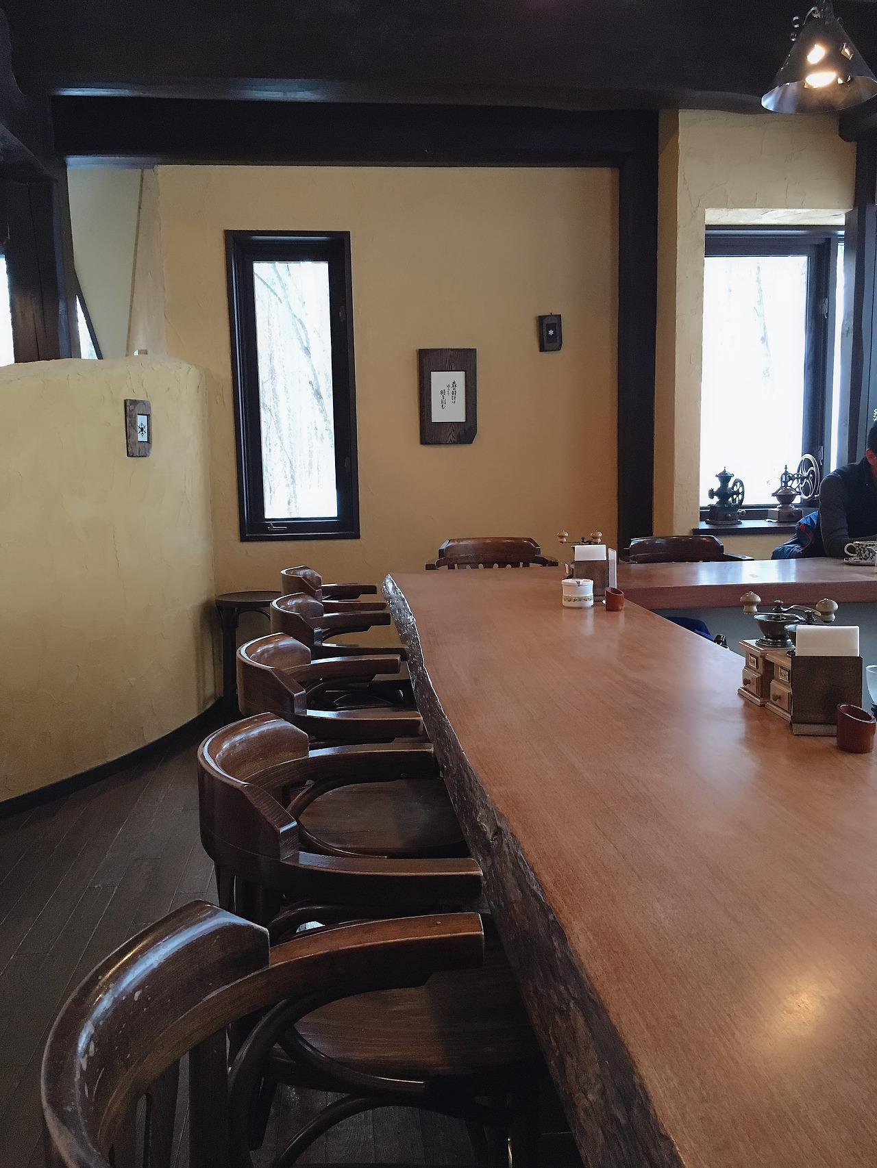 조금 기다렸더니 다행히 카운터 자리를 안내받을 수 있었고, 거의 꽉 차 있던 카운터 손님들이 하나둘씩 일어나서 결국엔 나 혼자 앉게 된 순간도 있었다. 시간 서둘러야 되냐고 직원님이 물어보셔서 첨엔 무슨 말이지? 했는데 원두 핸드밀로 갈게 해 주시려고 물어보는 거였다. 아 그럼요 그럼요. 하면서 원두를 핸드밀로 갈고, 향을 맡고, 맛있게 내려주신 커피를 마셨다. 너무 좋은 시간이었다. 8년 만에 여길 다시 오고, 그때처럼 내가 분쇄한 커피를 마시고. 그때 커피를 내려주시던 아저씨는 안 계시지만 창밖으로 보이는 풍경이 그때와 같은데 눈만 소복하게 쌓였을 뿐이라서 그것도 참 좋았다. 혼자라서 1일 투어를 좀 망설였는데 오길 잘한 것 같다. 의도한 것은 아니지만 8년 전 여름에 왔던 장소에 다시 가서 그때와 다른 겨울의 풍경을 볼 수 있었다. 같은 듯 다르고, 다른 듯 같은 풍경을 보면서 옛 추억에 잠기는 아주 행복하고 기쁜 시간이었다.