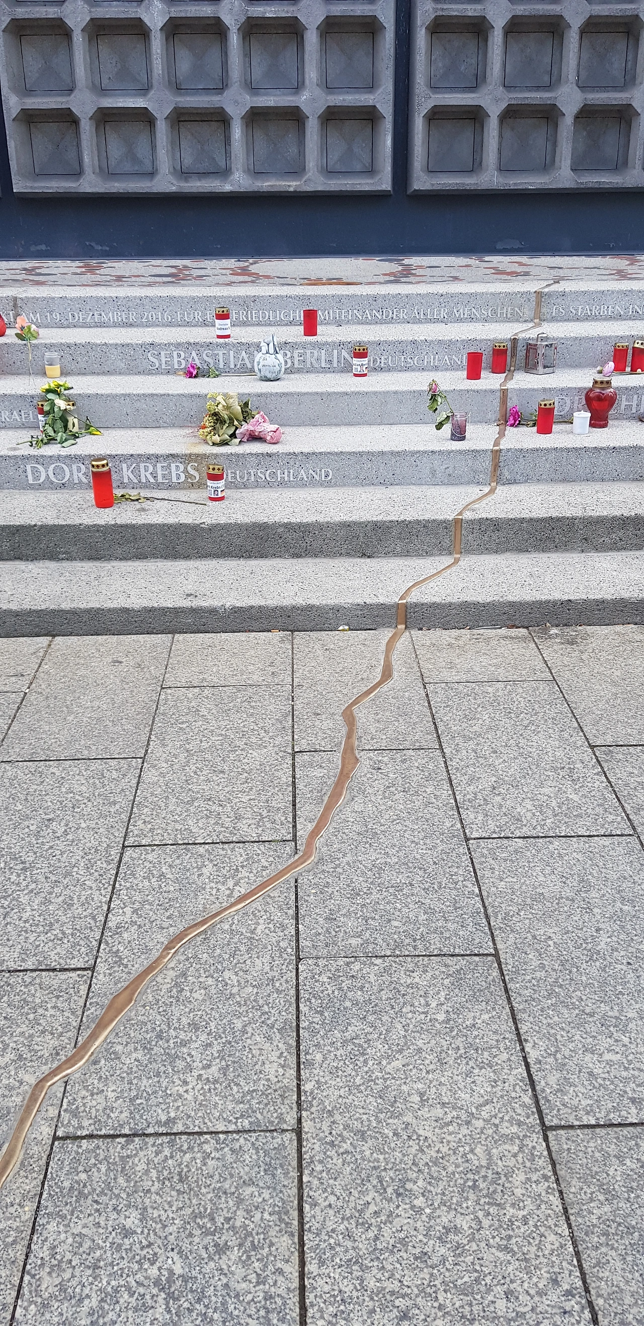 :그것은 2016년 12월 19일의 희생자와 유가족, 상처 입은 이들과 현 사회에서 발생하는 분열을 나타낸다. 테러는 우리 사회의 개방성과 관용에 도전했다. 우리는이 균열을 나타내고 싶었고 그것을 치유할 수 있음을 보여주고 싶었다. 치유는 잊거나 억압되는 것이 아니라 반복적으로 계속되어야 한다. 우리는 금빛이 나는 청동 합금으로 균열을 메꾸고 막았다. 갈라진 틈은 상처이자 동시에 치유를 의미한다.